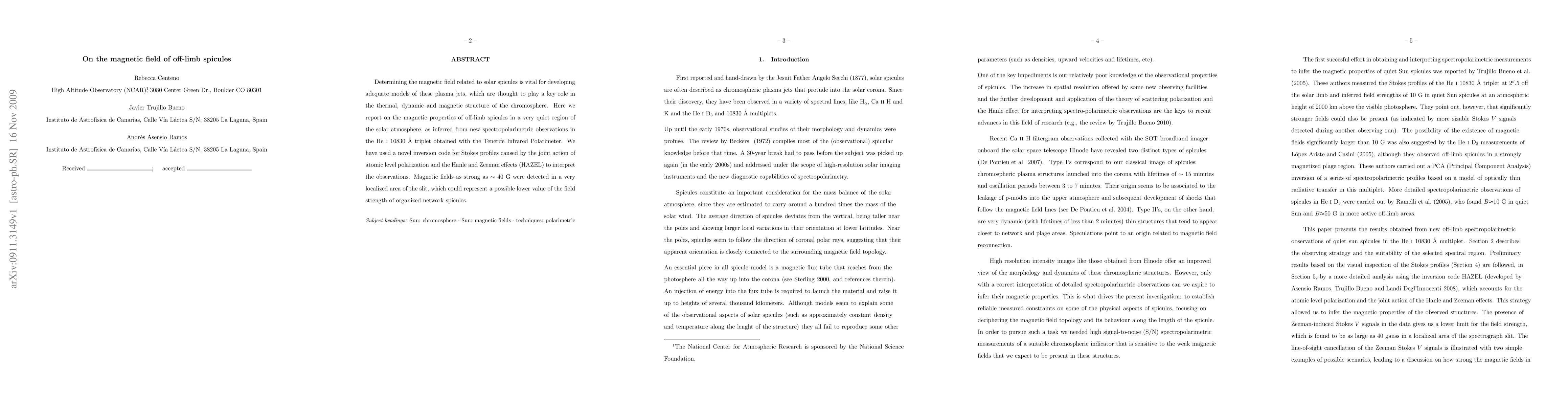 Determining the magnetic field related to solar spicules is vital for developing adequate models of these plasma jets, which are thought to play a key role in the thermal, dynamic and magnetic structure of the Chromosphere. Here we report on the magnetic properties of off-limb spicules in a very quiet region of the solar atmosphere, as inferred from new spectropolarimetric observations in the He I 10830 A triplet obtained with the Tenerife Infrared Polarimeter. We have used a novel inversion code for Stokes profiles caused by the joint action of atomic level polarization and the Hanle and Zeeman effects (HAZEL) to interpret the observations. Magnetic fields as strong as ~40G were detected in a very localized area of the slit, which could represent a possible lower value of the field strength of organized network spicules.
