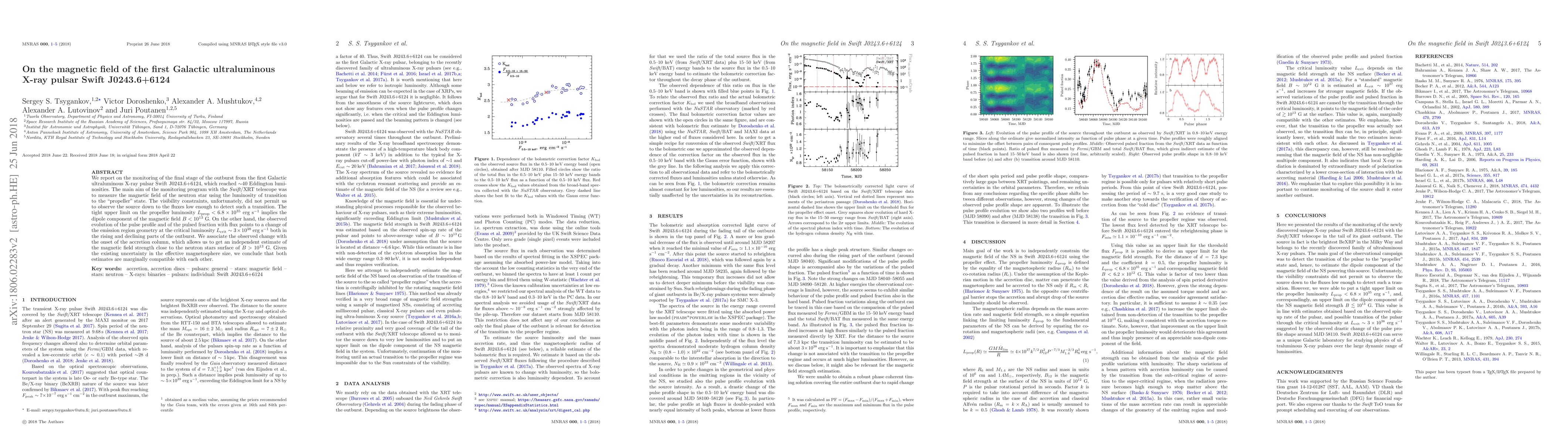 We report on the monitoring of the final stage of the outburst from the first Galactic ultraluminous X-ray pulsar Swift J0243.6+6124, which reached $\sim$40 Eddington luminosities at the peak of the outburst. The main aim of the monitoring program with the {\it Swift}/XRT telescope was to measure the magnetic field of the neutron star using the luminosity of transition to the "propeller" state. The visibility constraints, unfortunately, did not permit us to observe the source down to the fluxes low enough to detect such a transition. The tight upper limit on the propeller luminosity $L_{\rm prop}<6.8\times10^{35}$ erg s$^{-1}$ implies the dipole component of the magnetic field $B<10^{13}$ G, under plausible assumptions on the effective magnetosphere size. On the other hand, the observed evolution of the pulse profile and of the pulsed fraction with flux points to a change of the emission region geometry at the critical luminosity $L_{\rm crit}\sim3\times10^{38}$ erg s$^{-1}$ both in the rising and declining parts of the outburst. We associate the observed change with the onset of the accretion column, which allows us to get an independent estimate of the magnetic field strength close to the neutron stars surface of $B>10^{13}$ G. Given the existing uncertainty in the effective magnetosphere size, we conclude that both estimates are marginally compatible with each other.