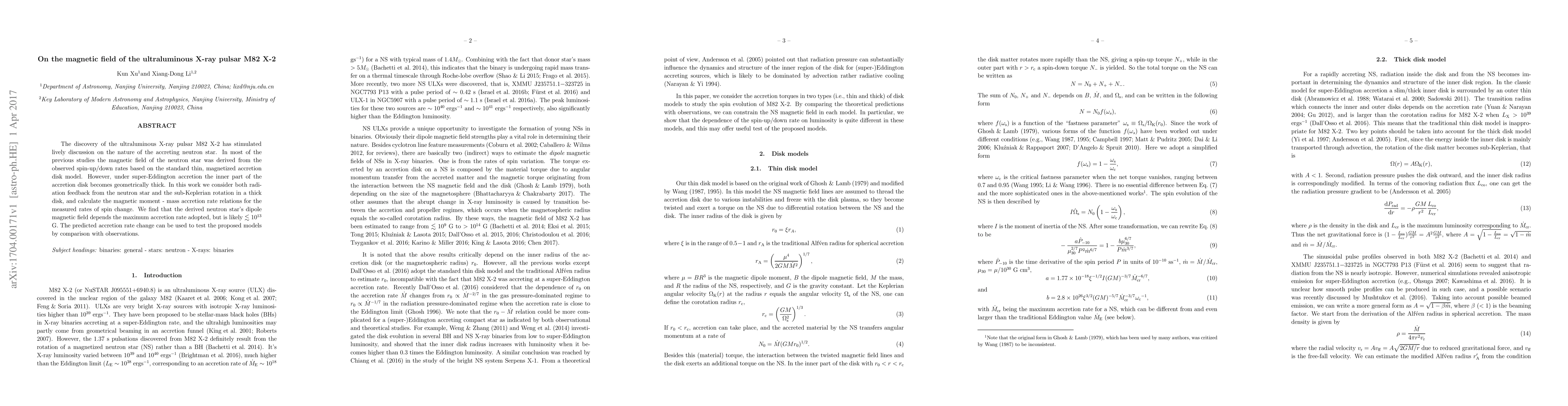 Researchers calculated a likely neutron star magnetic field of less than 10^13 G for M82 X-2, considering radiation feedback and thick disk effects in ultraluminous X-ray pulsars.