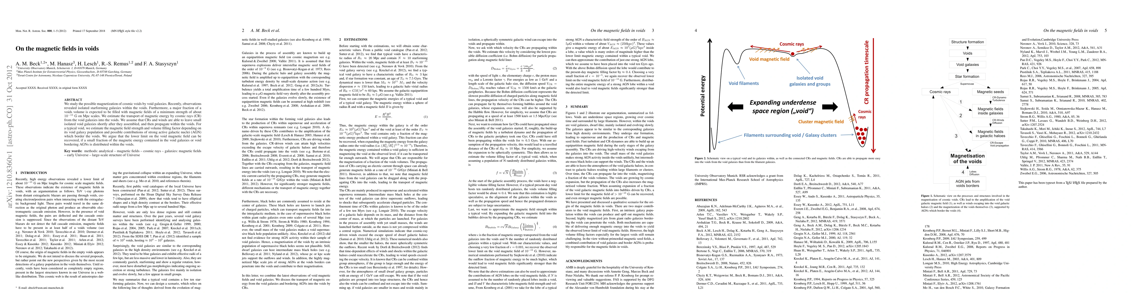 We study the possible magnetization of cosmic voids by void galaxies. Recently, observations revealed isolated starforming galaxies within the voids. Furthermore, a major fraction of a voids volume is expected to be filled with magnetic fields of a minimum strength of about $10^{-15}$ G on Mpc scales. We estimate the transport of magnetic energy by cosmic rays (CR) from the void galaxies into the voids. We assume that CRs and winds are able to leave small isolated void galaxies shortly after they assembled, and then propagate within the voids. For a typical void, we estimate the magnetic field strength and volume filling factor depending on its void galaxy population and possible contributions of strong active galactic nuclei (AGN) which border the voids. We argue that the lower limit on the void magnetic field can be recovered, if a small fraction of the magnetic energy contained in the void galaxies or void bordering AGNs is distributed within the voids.