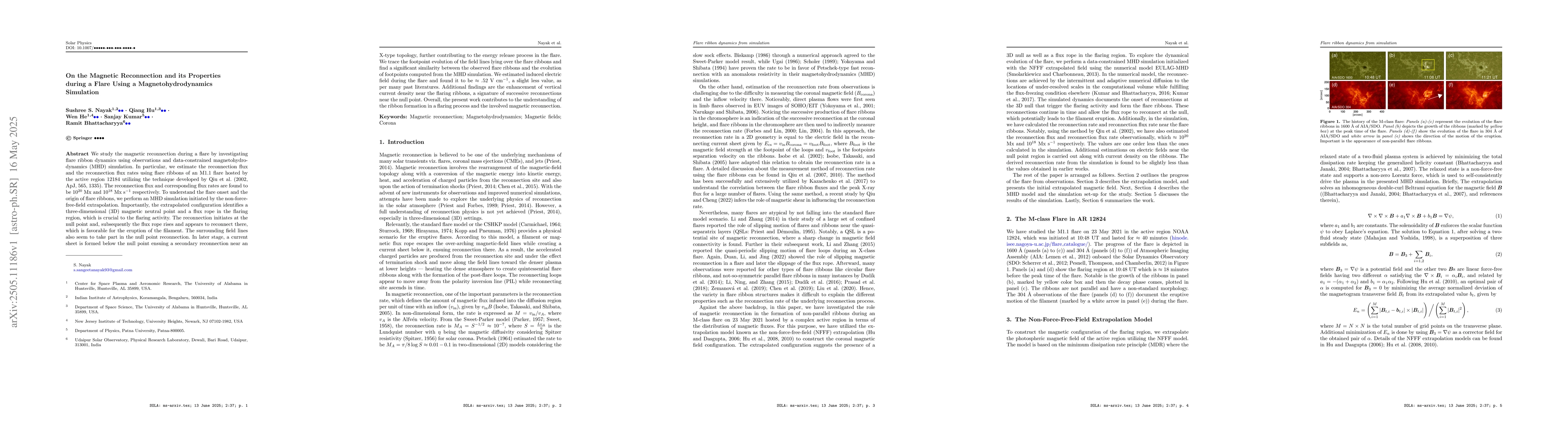 Researchers used magnetohydrodynamics simulation to study magnetic reconnection during a solar flare, finding that it released 10^20 Mx of energy and had a rate of 10^18 Mx/s, contributing to the understanding of flare ribbon formation and eruption.