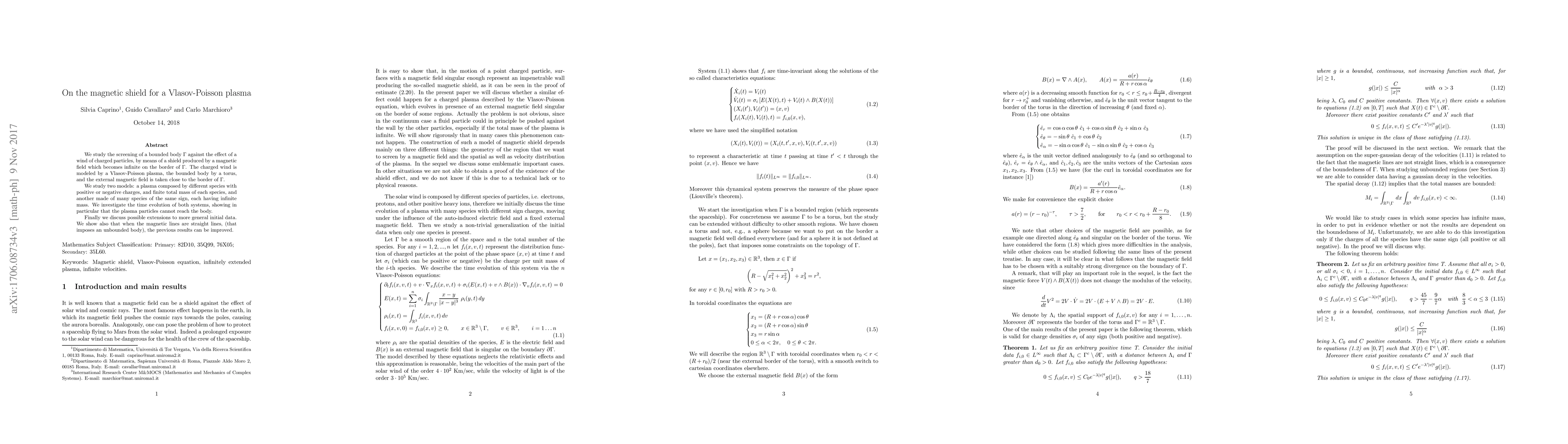 We study the screening of a bounded body $\Gamma$ against the effect of a wind of charged particles, by means of a shield produced by a magnetic field which becomes infinite on the border of $\Gamma$. The charged wind is modeled by a Vlasov-Poisson plasma, the bounded body by a torus, and the external magnetic field is taken close to the border of $\Gamma$. We study two models: a plasma composed by different species with positive or negative charges, and finite total mass of each species, and another made of many species of the same sign, each having infinite mass. We investigate the time evolution of both systems, showing in particular that the plasma particles cannot reach the body. Finally we discuss possible extensions to more general initial data. We show also that when the magnetic lines are straight lines, (that imposes an unbounded body), the previous results can be improved.
