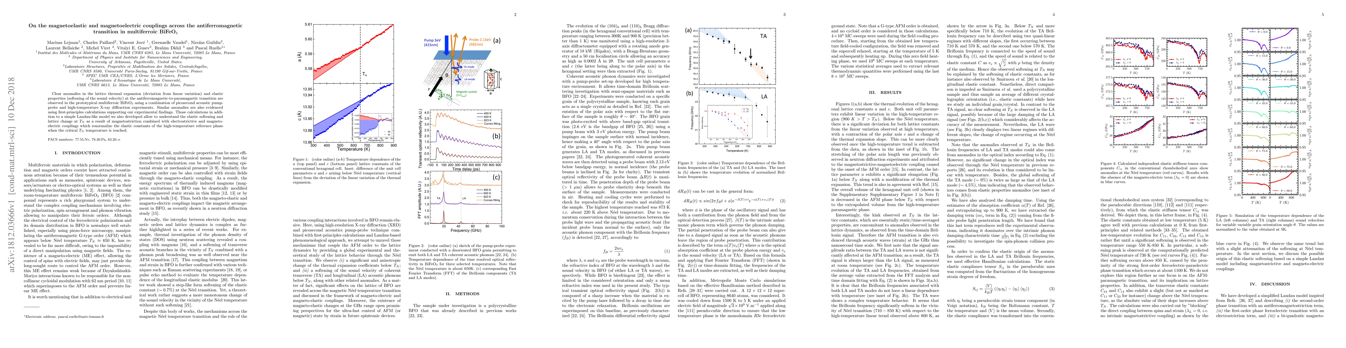 This research identifies anomalies in magnetoelastic and magnetoelectric couplings in BiFeO3 during its antiferromagnetic transition, observed via thermal expansion and elastic property changes. First-principles calculations and a Landau-like model elucidate that these anomalies arise from magnetostriction and renormalized elastic constants at the critical temperature.