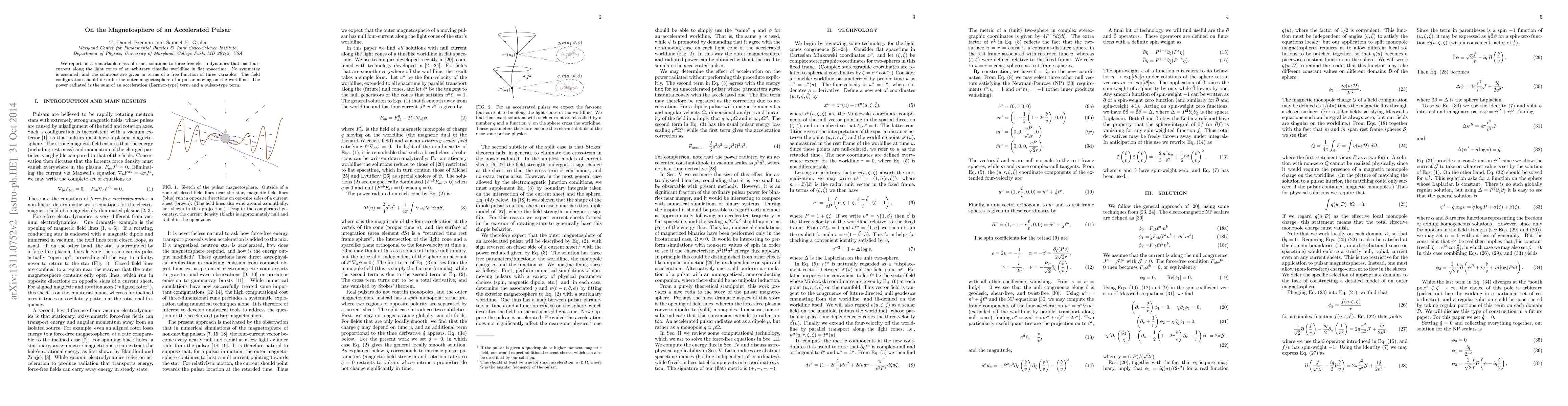 We report on a remarkable class of exact solutions to force-free electrodynamics that has four-current along the light cones of an arbitrary timelike worldline in flat spacetime. No symmetry is assumed, and the solutions are given in terms of a free function of three variables. The field configuration should describe the outer magnetosphere of a pulsar moving on the worldline. The power radiated is the sum of an acceleration (Larmor-type) term and a pulsar-type term.