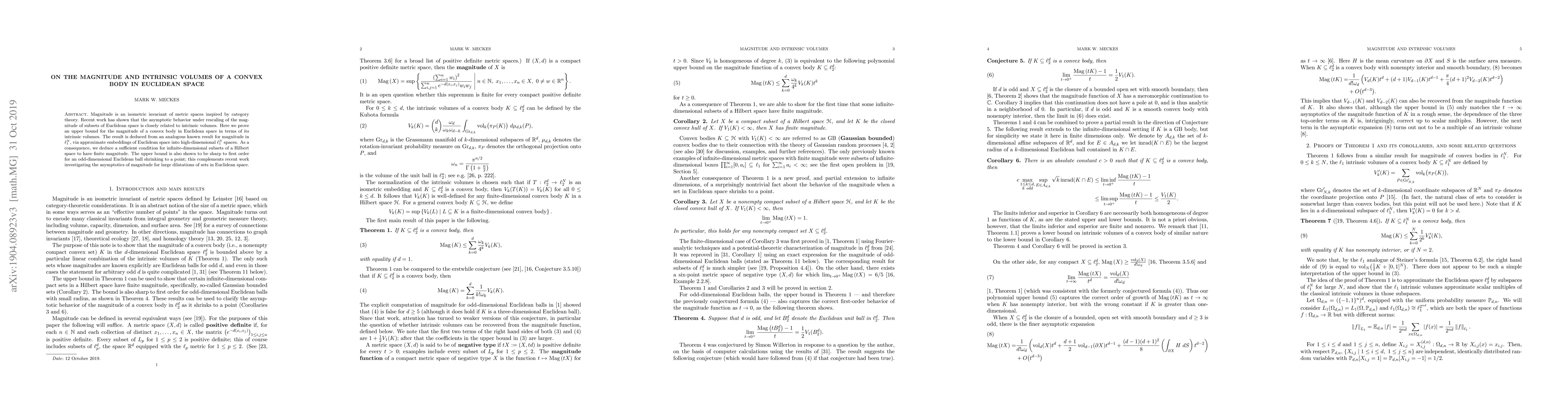 This paper establishes an upper bound for the magnitude of convex bodies in Euclidean space in terms of their intrinsic volumes, derived from analogous results in $\ell_1^N$. It also provides a sufficient condition for infinite-dimensional subsets of Hilbert spaces to have finite magnitude, demonstrating the sharpness of the bound for an odd-dimensional Euclidean ball.