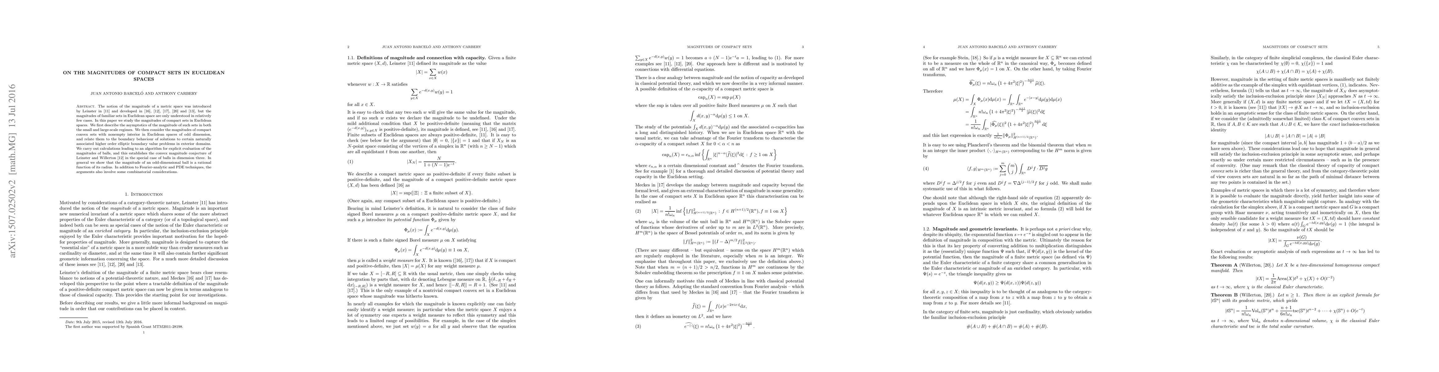 This paper investigates the magnitudes of compact sets in Euclidean spaces, providing asymptotic analyses for small and large scales. It particularly examines the magnitudes of compact convex sets in odd-dimensional spaces, relating them to solutions of higher-order elliptic boundary value problems, and establishes the convex magnitude conjecture for balls in dimension three by presenting an algorithm for their explicit evaluation.
