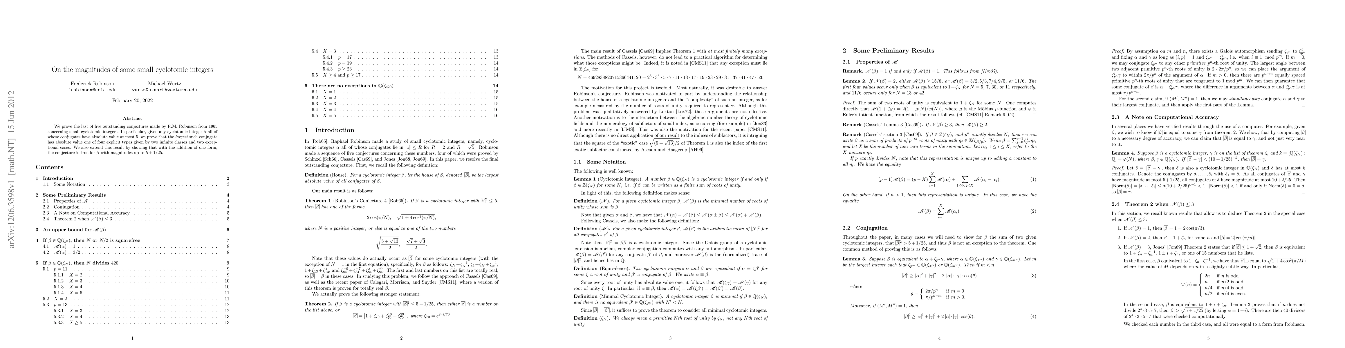 This paper resolves the final conjecture by R.M. Robinson on small cyclotomic integers, proving that the largest conjugate of any such integer with absolute values ≤ 5 falls into four specific types. The authors also extend the result to cover magnitudes up to 5+1/25.