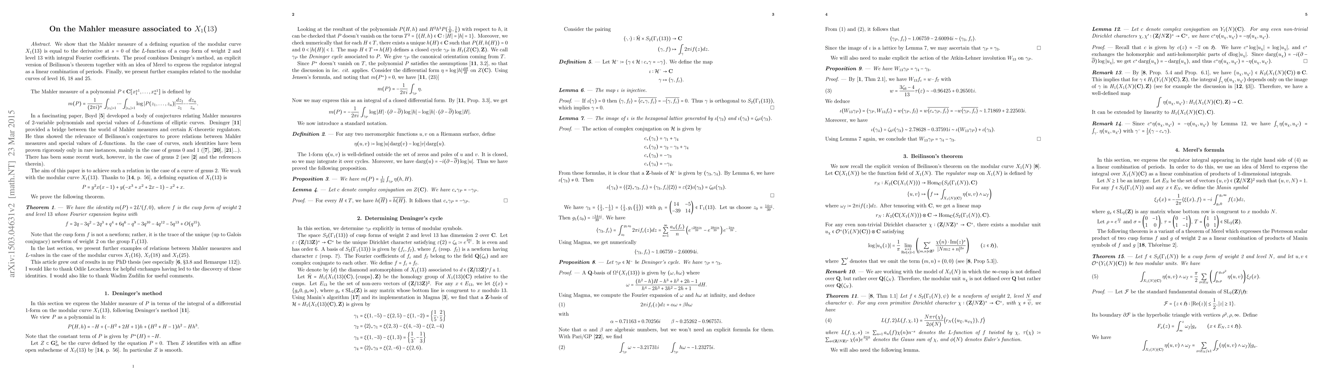 We show that the Mahler measure of a defining equation of the modular curve $X_1(13)$ is equal to the derivative at $s=0$ of the $L$-function of a cusp form of weight 2 and level 13 with integral Fourier coefficients. The proof combines Deninger's method, an explicit version of Beilinson's theorem together with an idea of Merel to express the regulator integral as a linear combination of periods. Finally, we present further examples related to the modular curves of level 16, 18 and 25.