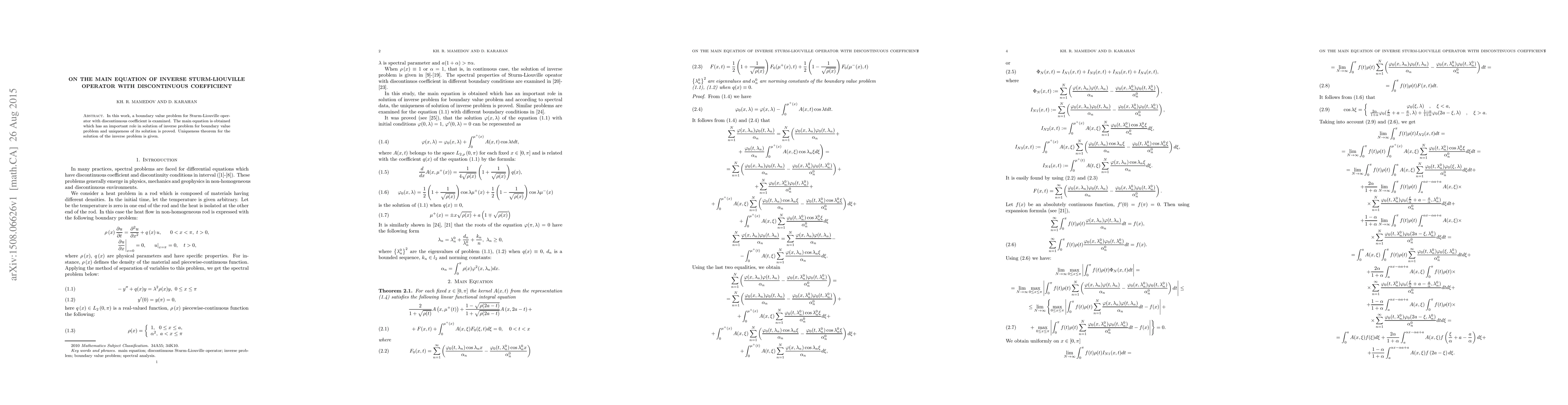 This paper investigates a boundary value problem for the Sturm-Liouville operator with a discontinuous coefficient, deriving a key equation crucial for solving inverse problems. It proves the uniqueness of the solution and provides a theorem for the inverse problem.