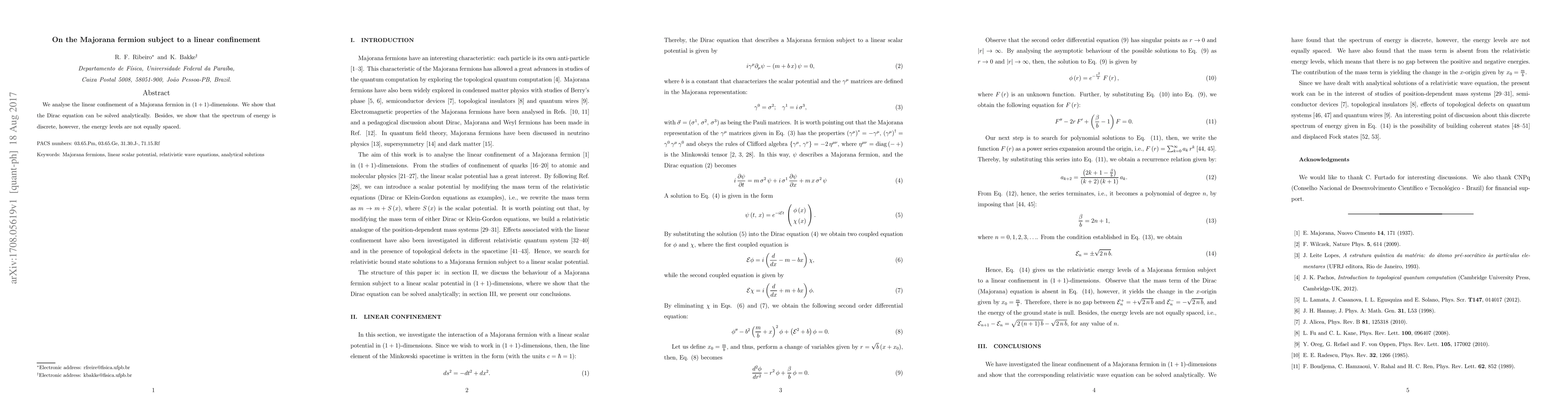 This research analyzes the linear confinement of a Majorana fermion in 1+1 dimensions and shows that its energy spectrum is discrete but not equally spaced, with solutions to the Dirac equation provided.