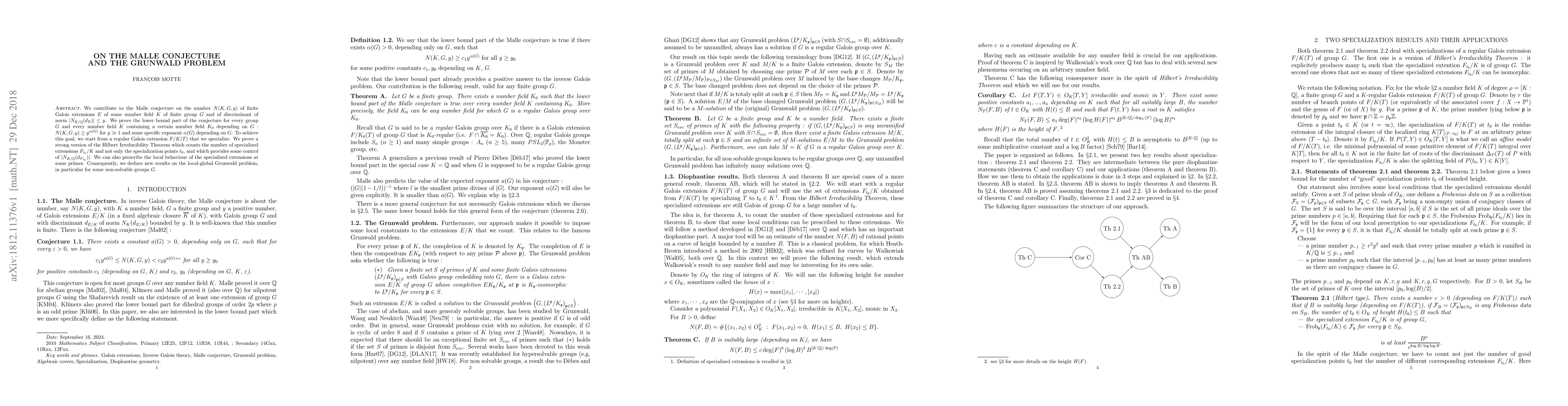 We contribute to the Malle conjecture on the number N (K, G, y) of finite Galois extensions E of some number field K of finite group G and of discriminant of norm |N K/Q (d E)| $\le$ y. We prove the lower bound part of the conjecture for every group G and every number field K containing a certain number field K 0 depending on G : N (K, G, y) $\ge$ y $\alpha$(G) for y 1 and some specific exponent $\alpha$(G) depending on G. To achieve this goal, we start from a regular Galois extension F/K(T) that we specialize. We prove a strong version of the Hilbert Irreducibility Theorem which counts the number of specialized extensions F t0 /K and not only the specialization points t 0 , and which provides some control of |N K/Q (d Ft 0)|. We can also prescribe the local behaviour of the specialized extensions at some primes. Consequently, we deduce new results on the local-global Grunwald problem, in particular for some non-solvable groups G.