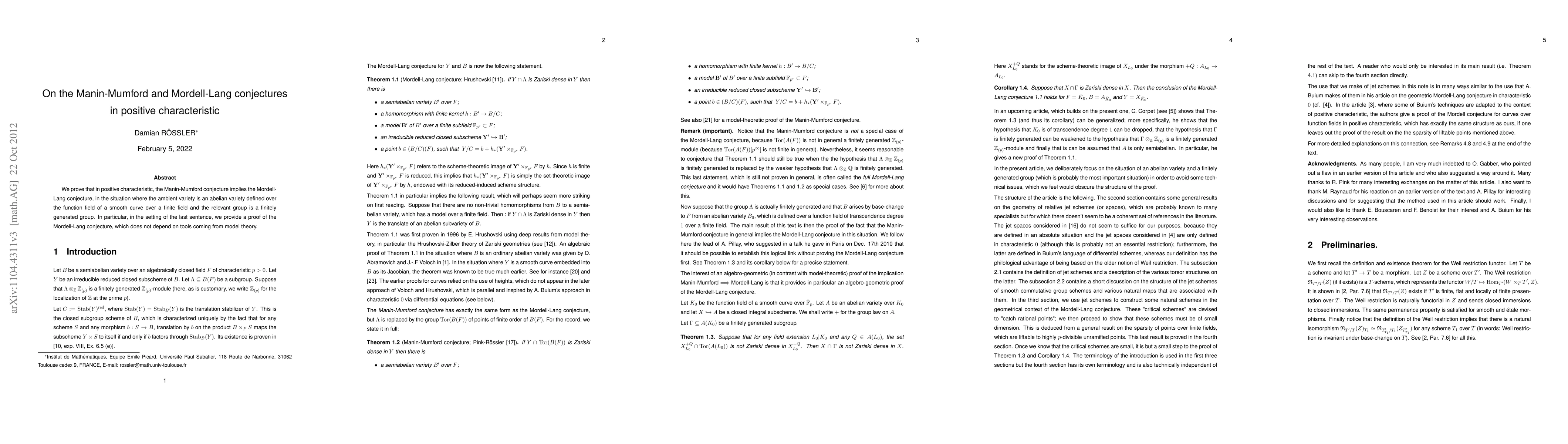 Summary: This paper proves that the Manin-Mumford conjecture in positive characteristic implies the Mordell-Lang conjecture for abelian varieties over function fields of smooth curves over finite fields. The proof avoids reliance on model theory, providing an independent verification of the Mordell-Lang conjecture in this context.