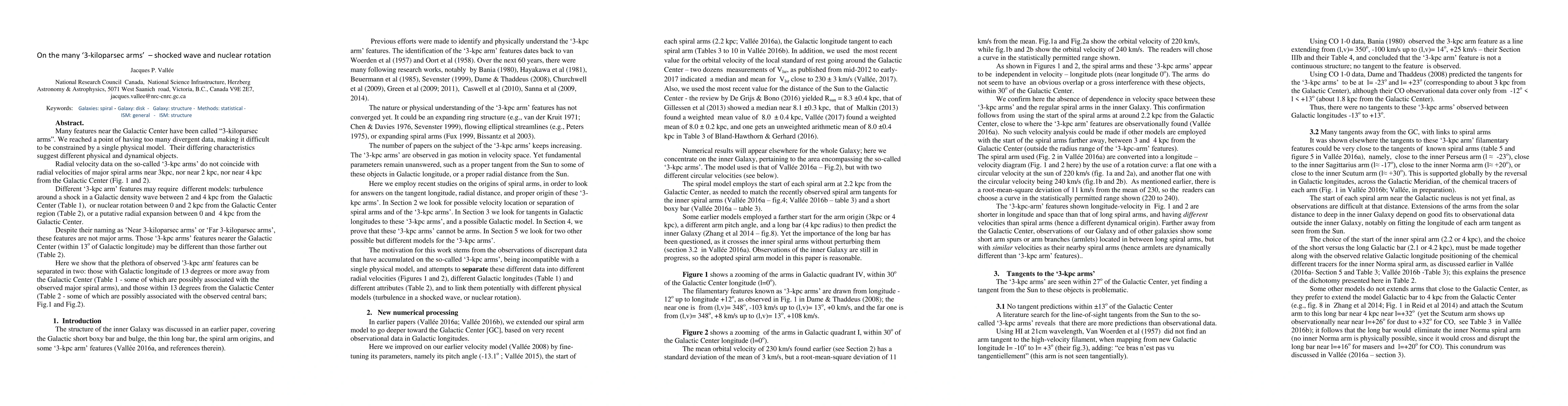 New research distinguishes between two types of '3-kiloparsec arms' near the Galactic Center, one associated with major spiral arms and another with central bars or nuclear rotation, revealing different physical models may be needed to explain their characteristics.