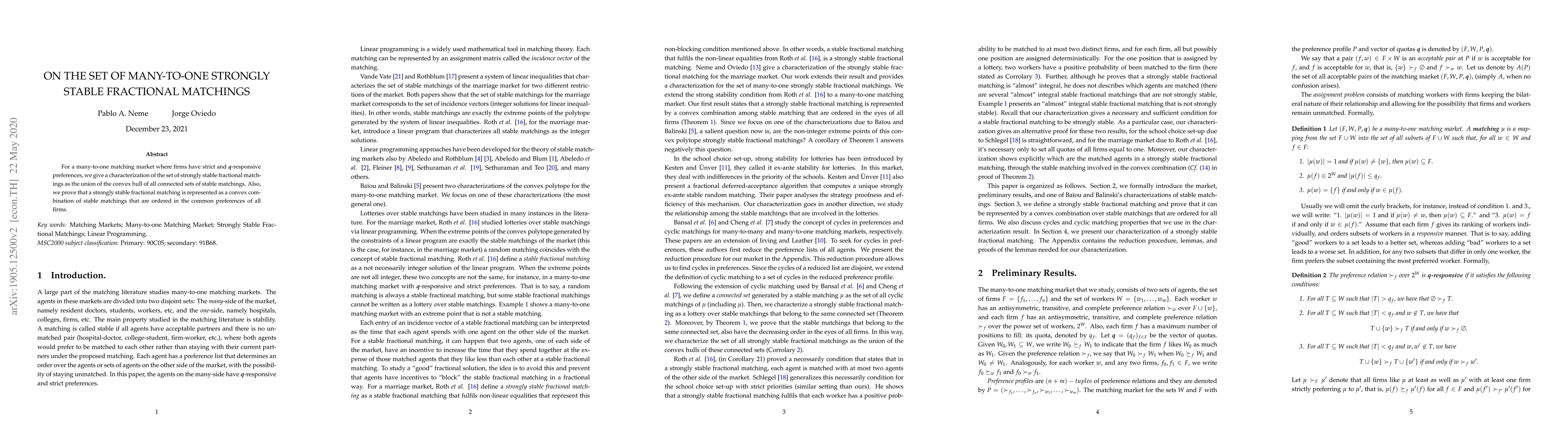 This paper characterizes the set of strongly stable fractional matchings in many-to-one matching markets with strict and q-responsive preferences, showing it as the convex hull of connected sets of stable matchings. It also proves that such fractional matchings can be represented as convex combinations of ordered stable matchings based on common firm preferences.