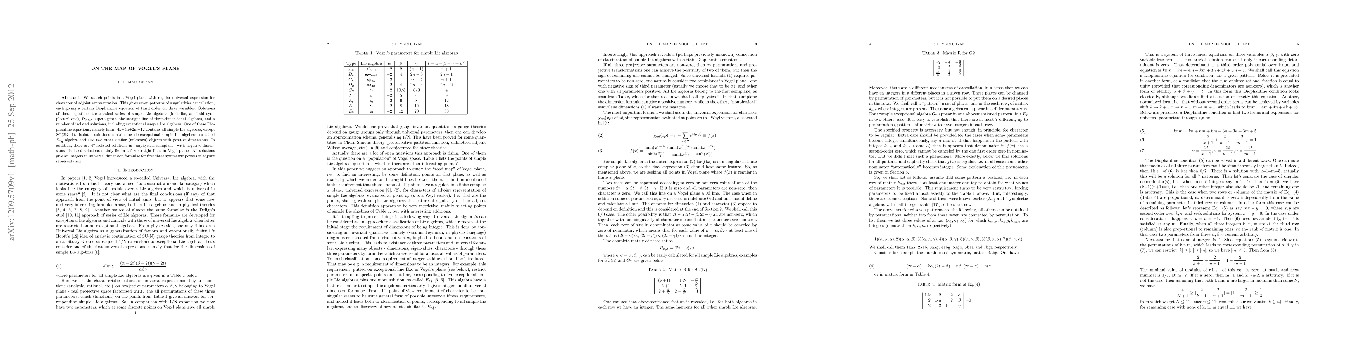 We search points in a Vogel plane with regular universal expression for character of adjoint representation. This gives seven patterns of singularities cancellation, each giving a certain Diophantine equation of third order on three variables. Solutions of these equations are classical series of simple Lie algebras (including an "odd symplectic" one), $D_{2,1,\lambda}$ superalgebra, the straight line of three-dimensional algebras, and a number of isolated solutions, including exceptional simple Lie algebras. One of these Diophantine equations, namely knm=4k+4n+2m+12 contains all simple Lie algebras, except SO(2N+1). Isolated solutions contain, beside exceptional simple Lie algebras, so called $E_{71/2}$ algebra and also two other similar (unknown) objects with positive dimensions. In addition, there are 47 isolated solutions in "unphysical semiplane" with negative dimensions. Isolated solutions mainly lie on a few straight lines in Vogel plane. All solutions give an integers in universal dimension formulae for first three symmetric powers of adjoint representation.