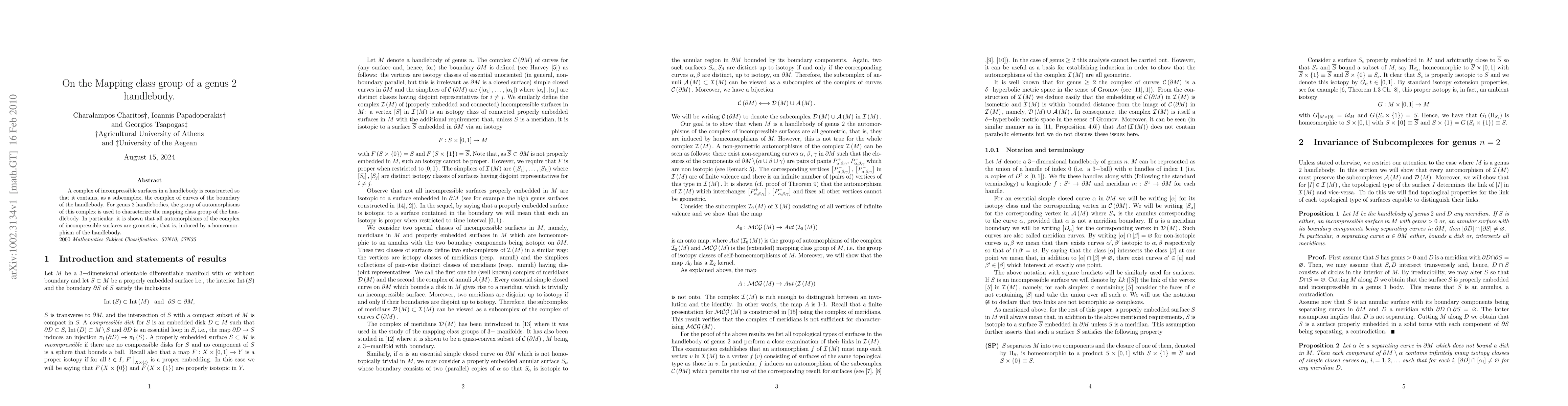 The paper's main technical contribution is the construction of a complex of incompressible surfaces in a genus 2 handlebody and the proof that its automorphisms are geometric, providing a new perspective on characterizing the mapping class group.