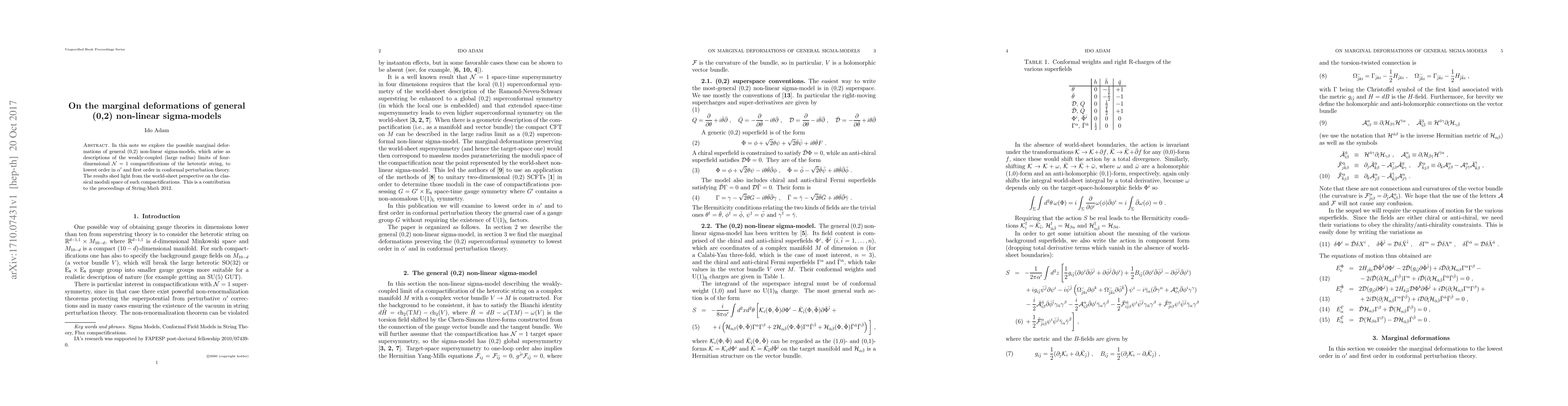 In this note we explore the possible marginal deformations of general (0,2) non-linear sigma-models, which arise as descriptions of the weakly-coupled (large radius) limits of four-dimensional $\mathcal{N}= 1$ compactifications of the heterotic string, to lowest order in $\alpha'$ and first order in conformal perturbation theory. The results shed light from the world-sheet perspective on the classical moduli space of such compactifications. This is a contribution to the proceedings of String-Math 2012.
