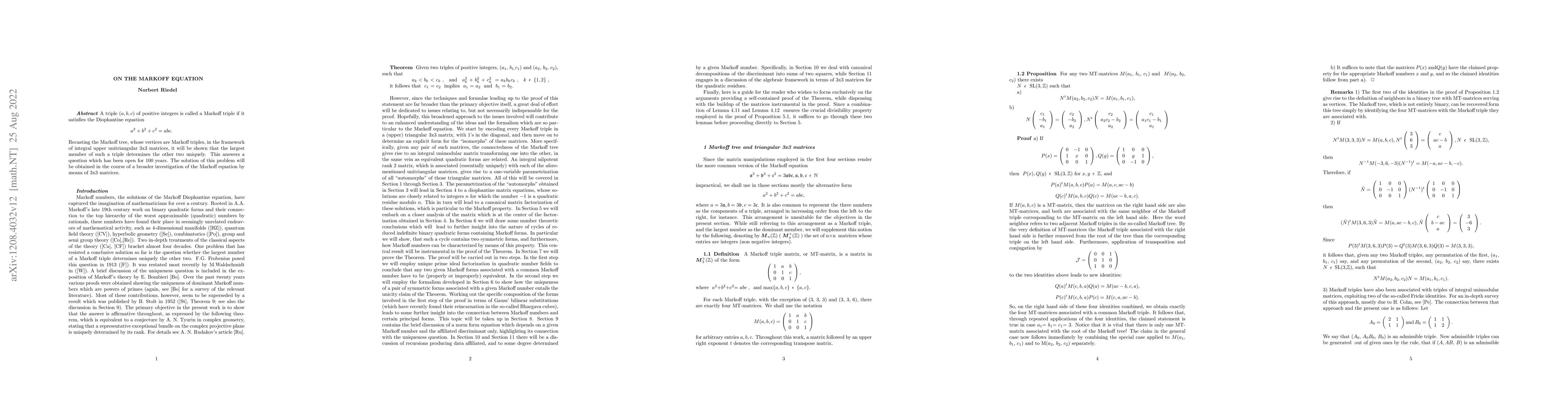 The paper demonstrates that in a Markoff triple (a, b, c) satisfying a² + b² + c² = abc, the largest member uniquely determines the other two, resolving a century-old question, through an analysis using integral upper triangular 3x3 matrices. This insight is part of a broader study of the Markoff equation.
