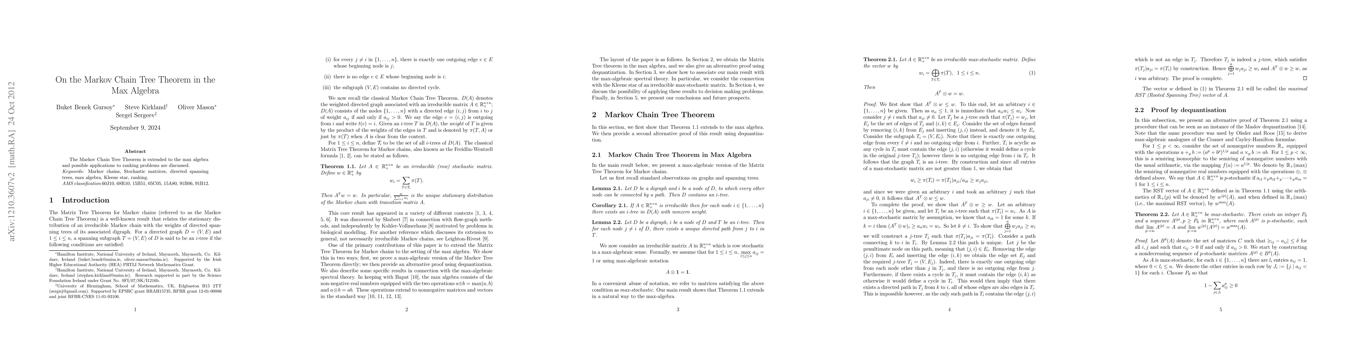 Summary: The paper extends the Markov Chain Tree Theorem to the max algebra framework and explores its potential applications in solving ranking problems. This extension provides new insights into the structure of max-algebraic processes.