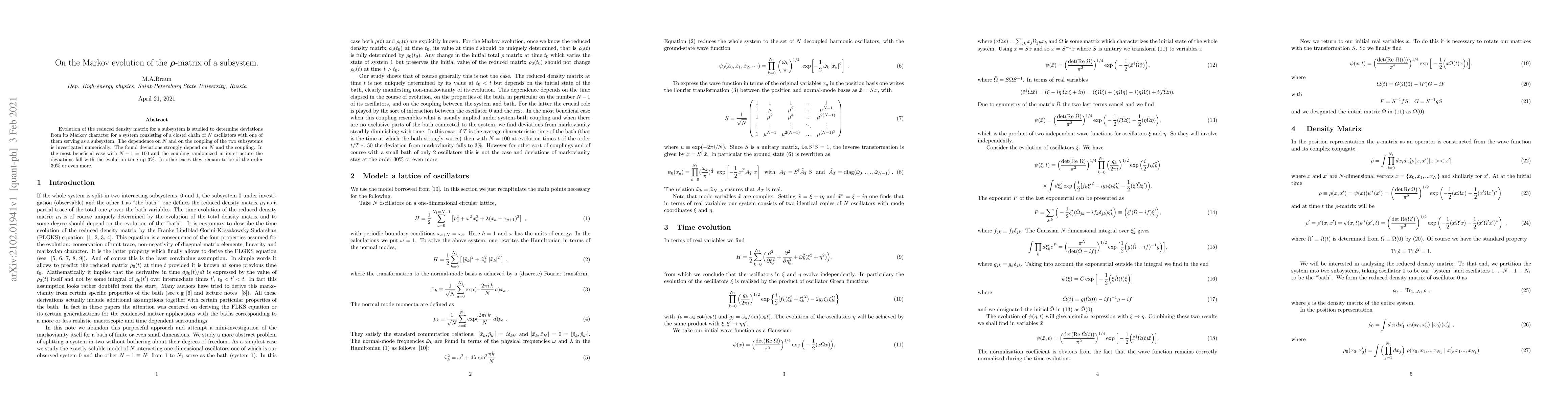 Evolution of the reduced density matrix for a subsystem is studied to determine deviations from its Markov character for a system consisting of a closed chain of $N$ oscillators with one of them serving as a subsystem. The dependence on $N$ and on the coupling of the two subsystems is investigated numerically. The found deviations strongly depend on $N$ and the coupling. In the most beneficial case with $N-1=100$ and the coupling randomized in its structure the deviations fall with the evolution time up 3\%. In other cases they remain to be of the order 30\% or even more.