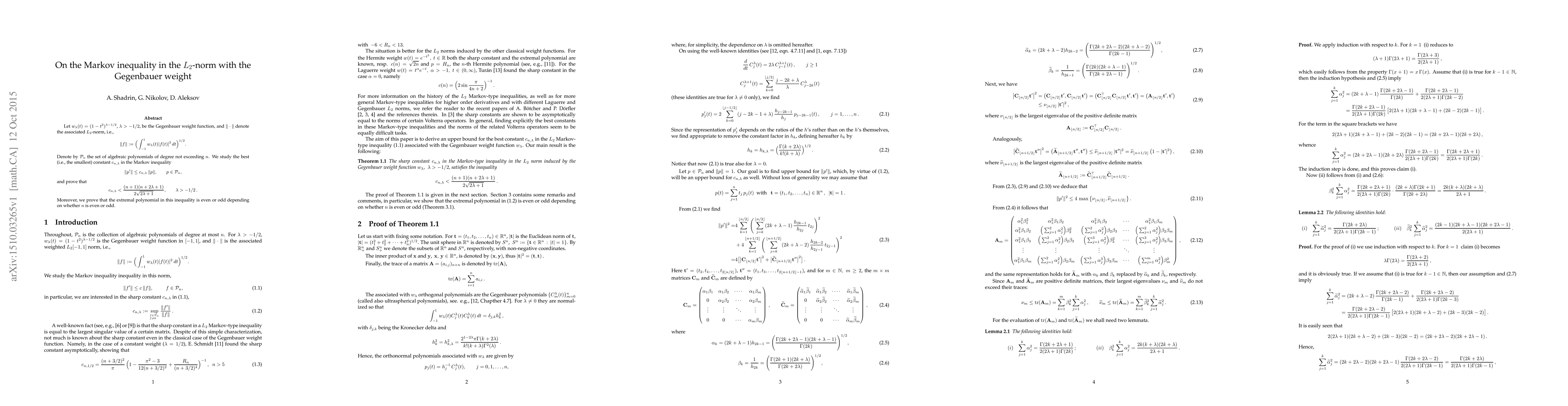The paper studies the Markov inequality for algebraic polynomials under the Gegenbauer weight, proving a bound on the smallest constant $c_{n, heta}$ and determining whether the extremal polynomial is even or odd depending on $n$.