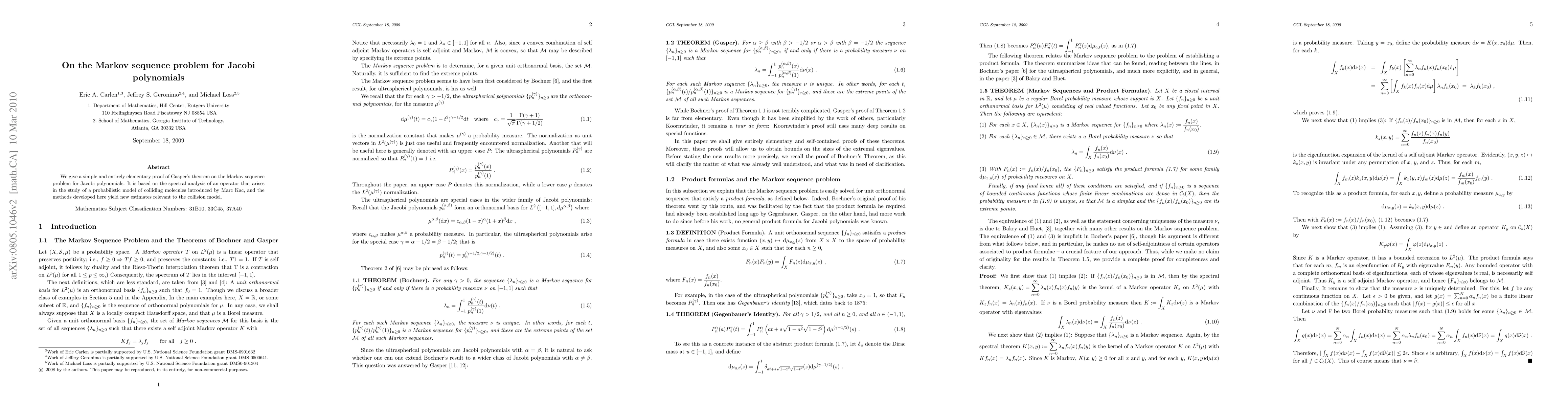 We give a simple and entirely elementary proof of Gasper's theorem on the Markov sequence problem for Jacobi polynomials. It is based on the spectral analysis of an operator that arises in the study of a probabilistic model of colliding molecules introduced by Marc Kac. In the process, we obtain some new integral formulas for ratios of Jacobi polynomials that generalize Gasper's product formula and a well known formula of Koornwinder.