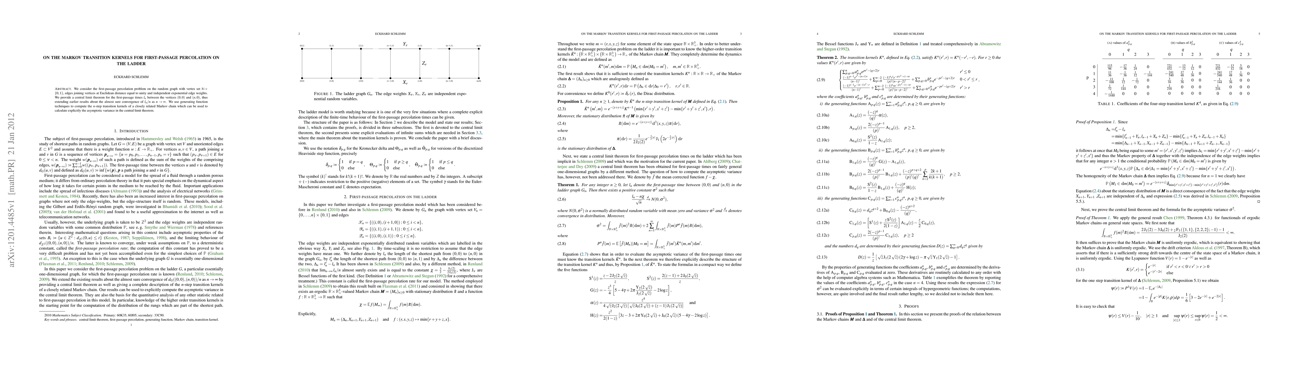 This paper studies first-passage percolation on a ladder graph with exponential edge weights, proving a central limit theorem for the first-passage times from (0,0) to (n,0). It employs generating function techniques to derive the n-step transition kernels for a related Markov chain, facilitating the explicit calculation of the asymptotic variance.