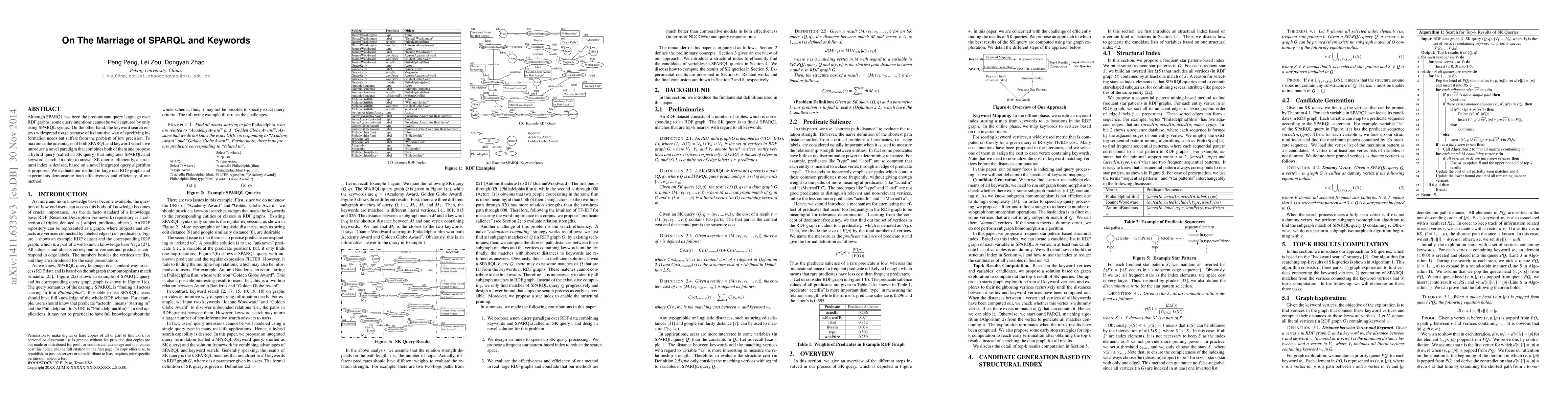 Although SPARQL has been the predominant query language over RDF graphs, some query intentions cannot be well captured by only using SPARQL syntax. On the other hand, the keyword search enjoys widespread usage because of its intuitive way of specifying information needs but suffers from the problem of low precision. To maximize the advantages of both SPARQL and keyword search, we introduce a novel paradigm that combines both of them and propose a hybrid query (called an SK query) that integrates SPARQL and keyword search. In order to answer SK queries efficiently, a structural index is devised, based on a novel integrated query algorithm is proposed. We evaluate our method in large real RDF graphs and experiments demonstrate both effectiveness and efficiency of our method.