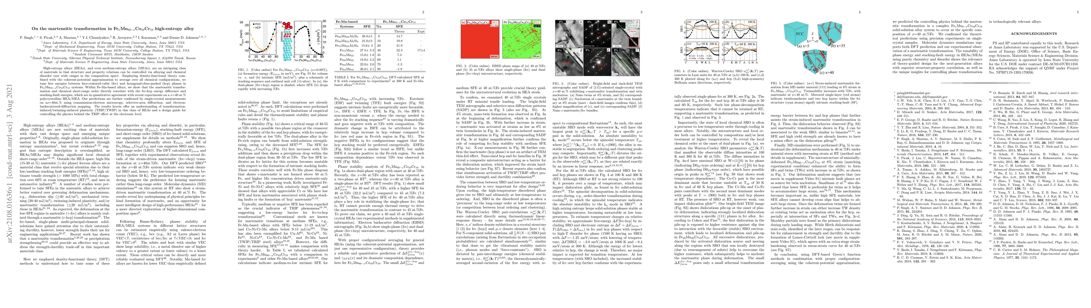 High-entropy alloys (HEAs), and even medium-entropy alloys (MEAs), are an intriguing class of materials in that structure and property relations can be controlled via alloying and chemical disorder over wide ranges in the composition space. Employing density-functional theory combined with the coherent-potential approximation to average over all chemical configurations, we tune free energies between face-centered-cubic (fcc) and hexagonal-close-packed (hcp) phases in Fe$_{x}$Mn$_{80-x}$Co$_{10}$Cr$_{10}$ systems.~Within Fe-Mn-based alloys, we show that the martensitic transformation and chemical short-range order directly correlate with the fcc-hcp energy difference and stacking-fault energies, which are in quantitative agreement with recent experiments on a $x$=40~at.\% polycrystalline HEA/MEA. Our predictions are further confirmed by single-crystal measurements on a$x$=40at.\% using transmission-electron microscopy, selective-area diffraction, and electron-backscattered-diffraction mapping. The results herein offer an understanding of transformation-induced/twinning-induced plasticity (TRIP/TWIP) in this class of HEAs and a design guide for controlling the physics behind the TRIP effect at the electronic level.