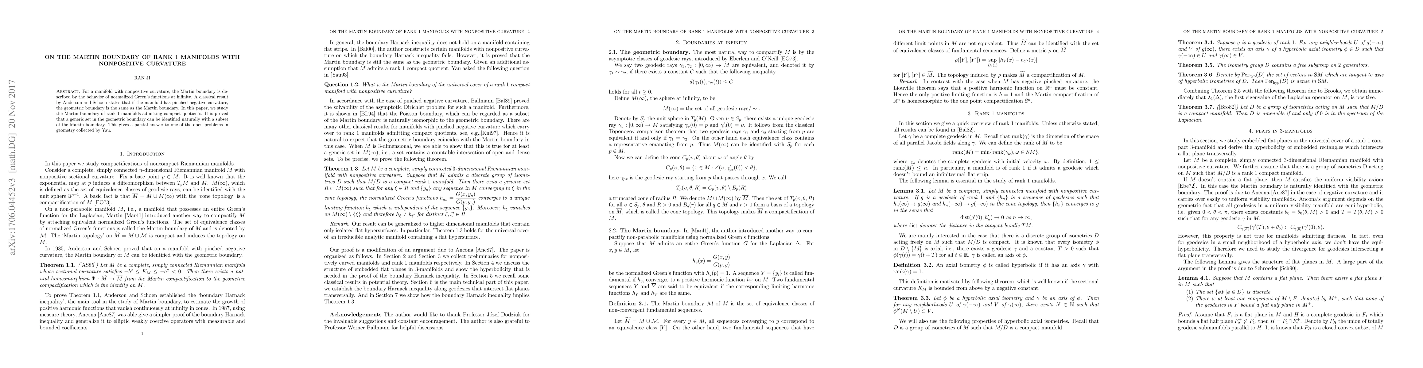 For a manifold with nonpositive curvature, the Martin boundary is described by the behavior of normalized Green's functions at infinity. A classical result by Anderson and Schoen states that if the manifold has pinched negative curvature, the geometric boundary is the same as the Martin boundary. In this paper, we study the Martin boundary for rank 1 manifolds admitting compact quotients. It is proved that a residual set in the geometric boundary can be identified naturally with a subset of the Martin boundary. This gives a partial answer to one of the open problems in geometry collected by Yau. Our proof is a modification of an argument due to Ancona.