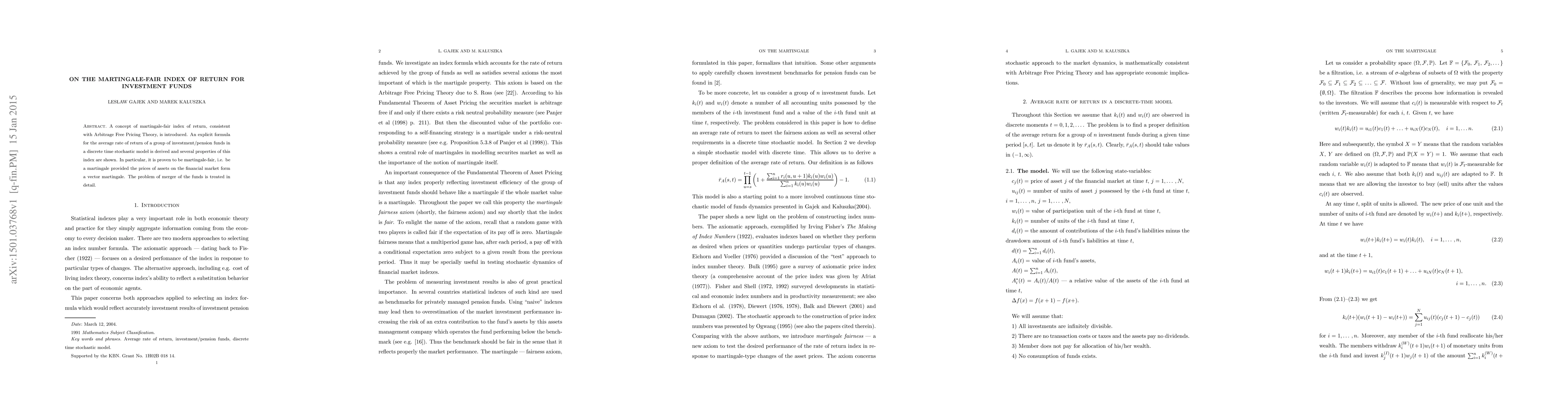 A concept of martingale-fair index of return, consistent with Arbitrage Free Pricing Theory, is introduced. An explicit formula for the average rate of return of a group of investment/pension funds in a discrete time stochastic model is derived and several properties of this index are shown. In particular, it is proven to be martingale-fair, i.e. be a martingale provided the prices of assets on the financial market form a vector martingale. The problem of merger of the funds is treated in detail.