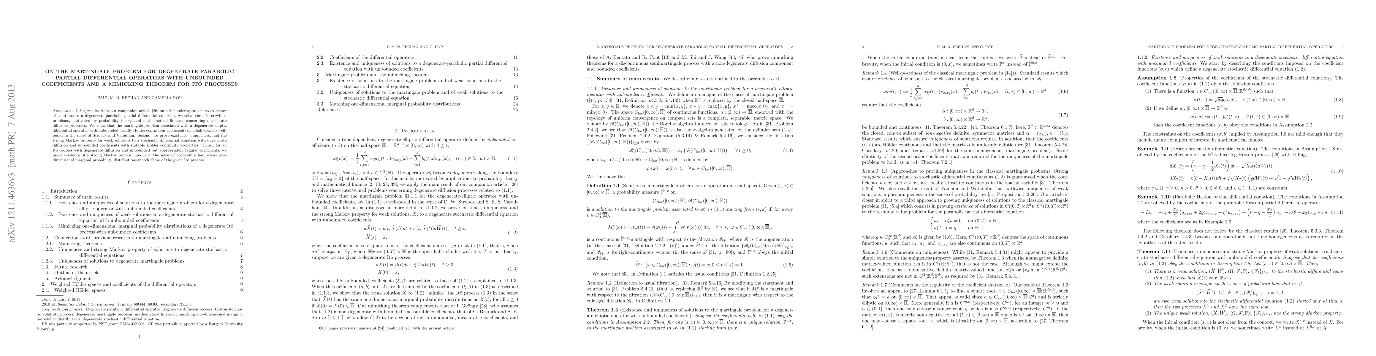 Using results from our companion article [arXiv:1112.4824v2] on a Schauder approach to existence of solutions to a degenerate-parabolic partial differential equation, we solve three intertwined problems, motivated by probability theory and mathematical finance, concerning degenerate diffusion processes. We show that the martingale problem associated with a degenerate-elliptic differential operator with unbounded, locally Holder continuous coefficients on a half-space is well-posed in the sense of Stroock and Varadhan. Second, we prove existence, uniqueness, and the strong Markov property for weak solutions to a stochastic differential equation with degenerate diffusion and unbounded coefficients with suitable H\"older continuity properties. Third, for an Ito process with degenerate diffusion and unbounded but appropriately regular coefficients, we prove existence of a strong Markov process, unique in the sense of probability law, whose one-dimensional marginal probability distributions match those of the given Ito process.