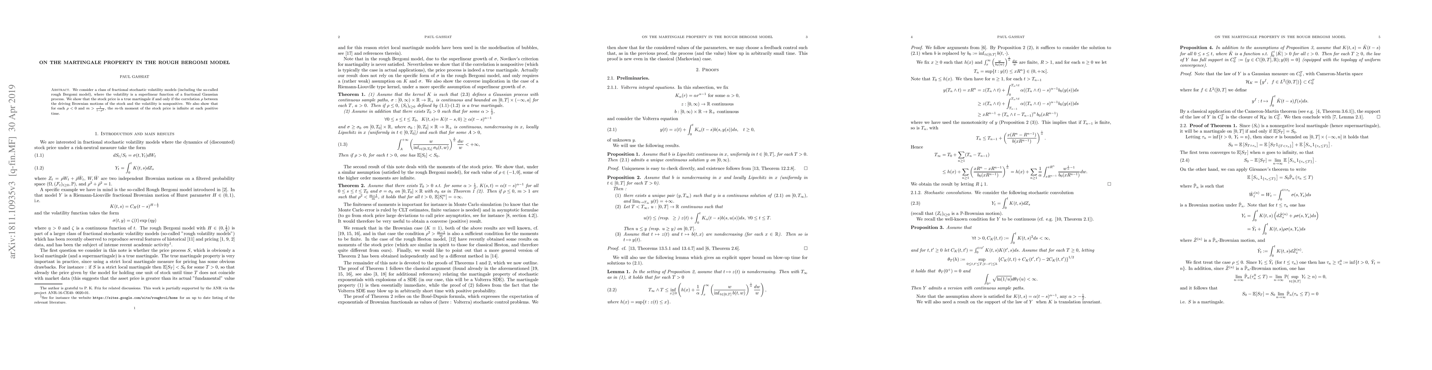 This paper examines the rough Bergomi model, a fractional stochastic volatility model. It proves that stock prices are true martingales only when the correlation between the stock and volatility Brownian motions is nonpositive. Furthermore, for negative correlations and moments greater than 1/(1-ρ²), the stock price's moments become infinite at any positive time.
