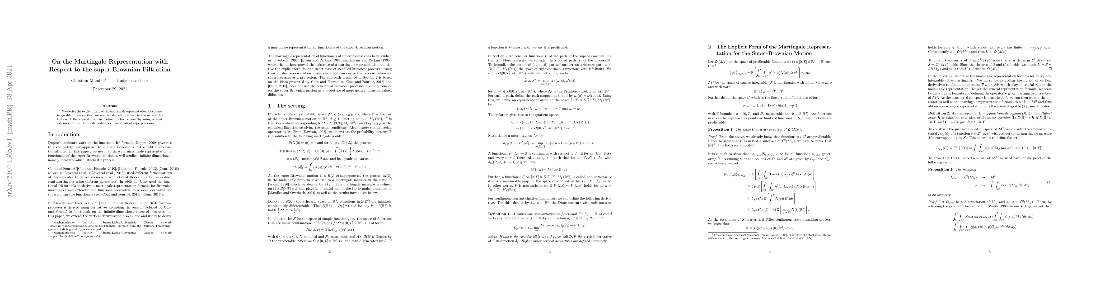 We derive the explicit form of the martingale representation for square-integrable processes that are martingales with respect to the natural filtration of the super-Brownian motion. This is done by using a weak extension of the Dupire derivative for functionals of superprocesses.