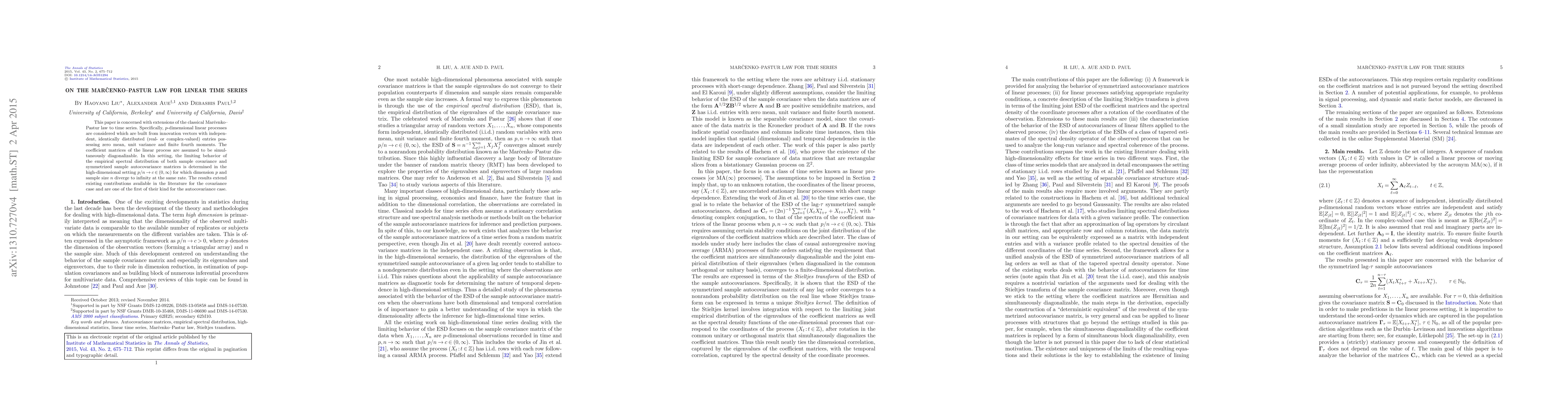 This paper is concerned with extensions of the classical Mar\v{c}enko-Pastur law to time series. Specifically, $p$-dimensional linear processes are considered which are built from innovation vectors with independent, identically distributed (real- or complex-valued) entries possessing zero mean, unit variance and finite fourth moments. The coefficient matrices of the linear process are assumed to be simultaneously diagonalizable. In this setting, the limiting behavior of the empirical spectral distribution of both sample covariance and symmetrized sample autocovariance matrices is determined in the high-dimensional setting $p/n\to c\in (0,\infty)$ for which dimension $p$ and sample size $n$ diverge to infinity at the same rate. The results extend existing contributions available in the literature for the covariance case and are one of the first of their kind for the autocovariance case.