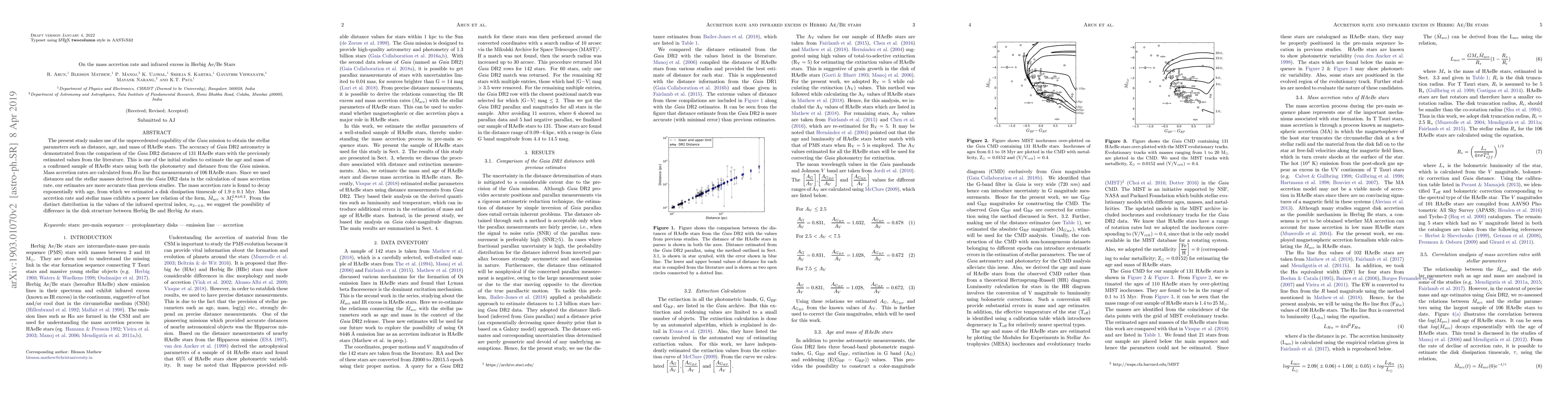 The present study makes use of the unprecedented capability of the Gaia mission to obtain the stellar parameters such as distance, age, and mass of HAeBe stars. The accuracy of Gaia DR2 astrometry is demonstrated from the comparison of the Gaia DR2 distances of 131 HAeBe stars with the previously estimated values from the literature. This is one of the initial studies to estimate the age and mass of a confirmed sample of HAeBe stars using both the photometry and distance from the Gaia mission. Mass accretion rates are calculated from $H\alpha$ line flux measurements of 106 HAeBe stars. Since we used distances and the stellar masses derived from the Gaia DR2 data in the calculation of mass accretion rate, our estimates are more accurate than previous studies. The mass accretion rate is found to decay exponentially with age, from which we estimated a disk dissipation timescale of $1.9\pm 0.1$ Myr. Mass accretion rate and stellar mass exhibits a power law relation of the form, $\dot{M}_{acc}$ $\propto$ $M_{*}^{2.8\pm0.2}$. From the distinct distribution in the values of the infrared spectral index, $n_{2-4.6}$, we suggest the possibility of difference in the disk structure between Herbig Be and Herbig Ae stars.