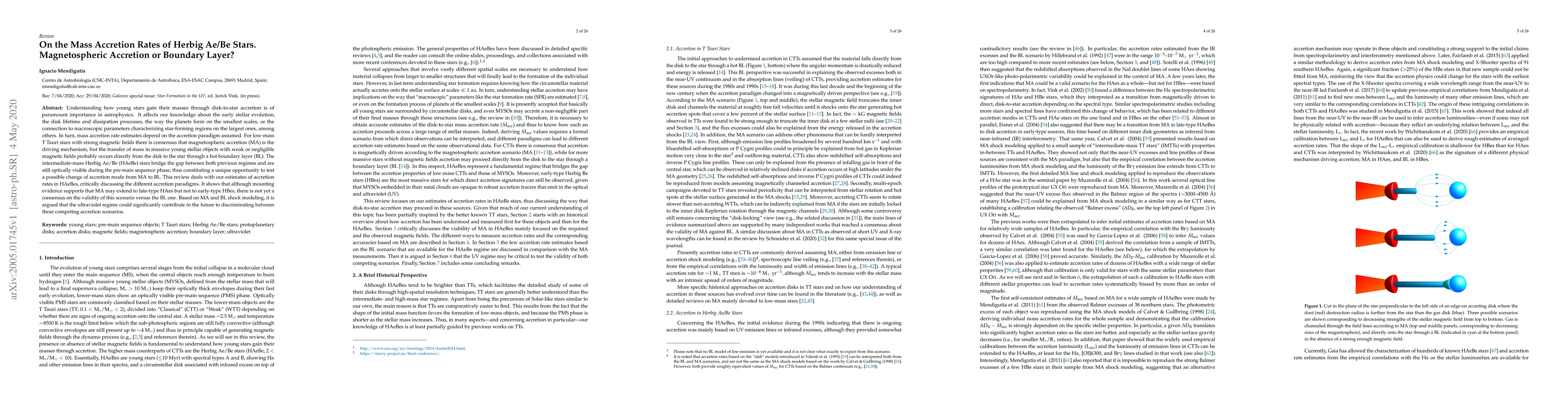 This review estimates mass accretion rates in Herbig Ae/Be stars, exploring two accretion paradigms: magnetospheric accretion and boundary layer transfer, with mixed results that leave room for future discrimination between the scenarios.