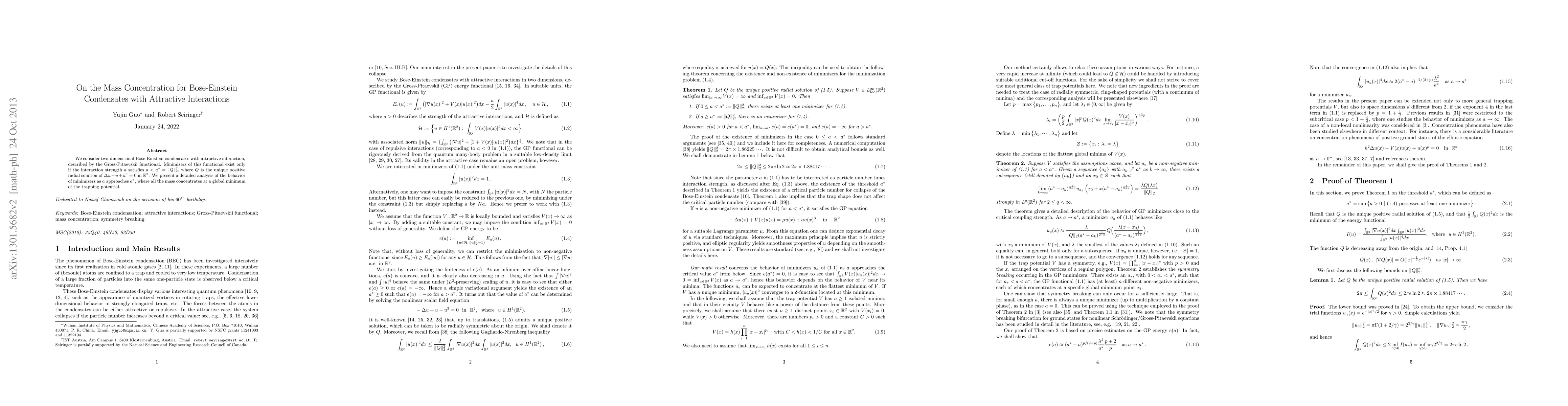 This paper investigates the existence and behavior of minimizers for two-dimensional Bose-Einstein condensates with attractive interactions, governed by the Gross-Pitaevskii functional. The study reveals that mass concentration occurs as the interaction strength approaches a critical value, leading to complete mass accumulation at the lowest point of the trapping potential.