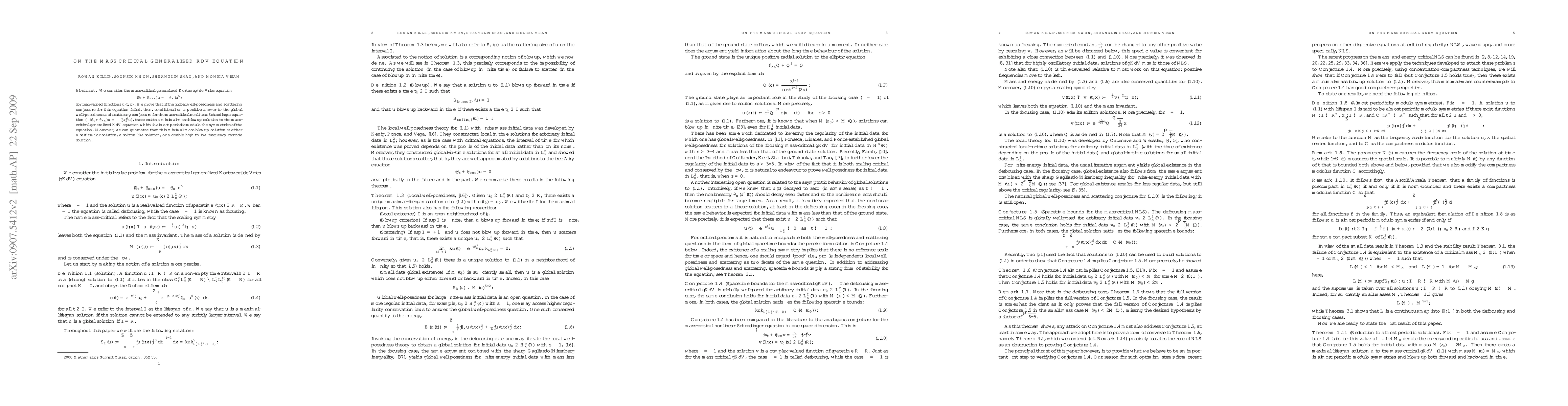 We consider the mass-critical generalized Korteweg--de Vries equation $$(\partial_t + \partial_{xxx})u=\pm \partial_x(u^5)$$ for real-valued functions $u(t,x)$. We prove that if the global well-posedness and scattering conjecture for this equation failed, then, conditional on a positive answer to the global well-posedness and scattering conjecture for the mass-critical nonlinear Schr\"odinger equation $(-i\partial_t + \partial_{xx})u=\pm (|u|^4u)$, there exists a minimal-mass blowup solution to the mass-critical generalized KdV equation which is almost periodic modulo the symmetries of the equation. Moreover, we can guarantee that this minimal-mass blowup solution is either a self-similar solution, a soliton-like solution, or a double high-to-low frequency cascade solution.
