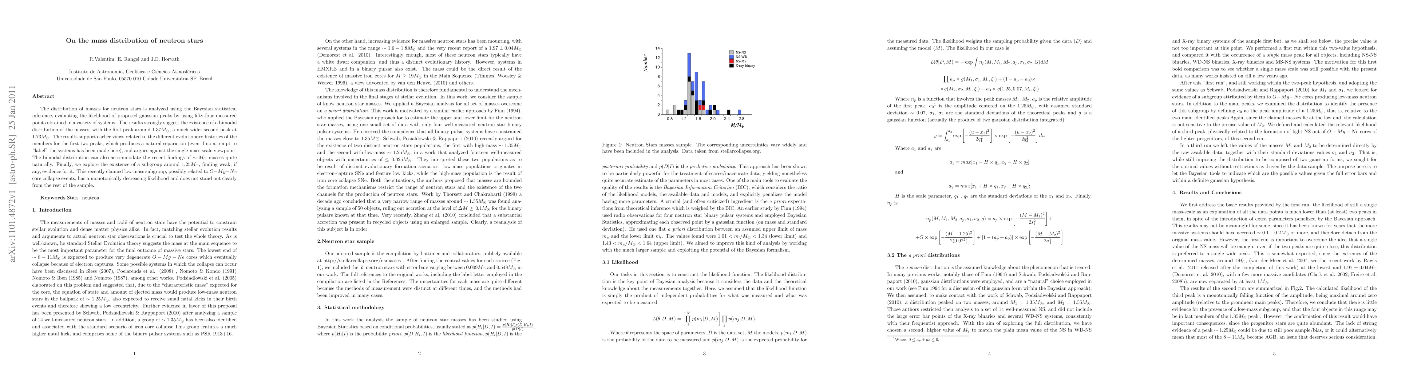 The distribution of masses for neutron stars is analyzed using the Bayesian statistical inference, evaluating the likelihood of proposed gaussian peaks by using fifty-four measured points obtained in a variety of systems. The results strongly suggest the existence of a bimodal distribution of the masses, with the first peak around $1.37 {M_{\odot}}$, and a much wider second peak at $1.73 {M_{\odot}}$. The results support earlier views related to the different evolutionary histories of the members for the first two peaks, which produces a natural separation (even if no attempt to "label" the systems has been made here), and argues against the single-mass scale viewpoint. The bimodal distribution can also accommodate the recent findings of $\sim M_{\odot}$ masses quite naturally. Finally, we explore the existence of a subgroup around $1.25 {M_{\odot}}$, finding weak, if any, evidence for it. This recently claimed low-mass subgroup, possibly related to $O-Mg-Ne$ core collapse events, has a monotonically decreasing likelihood and does not stand out clearly from the rest of the sample.