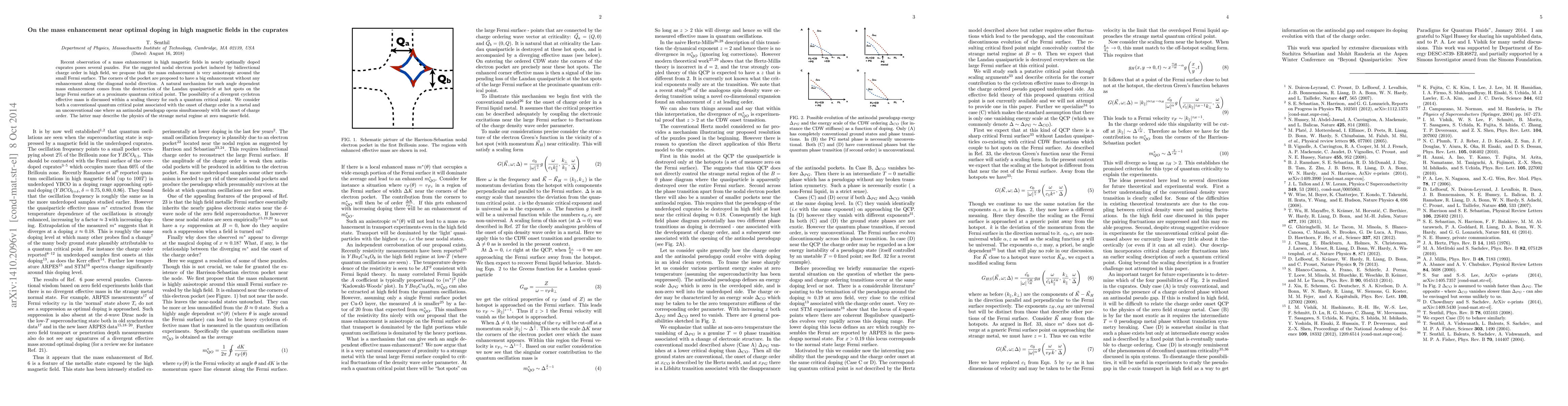 Recent observation of a mass enhancement in high magnetic fields in nearly optimally doped cuprates poses several puzzles. For the suggested nodal electron pocket induced by bidirectional charge order in high field, we propose that the mass enhancement is very anisotropic around the small Fermi surface. The corners of the pocket are proposed to have a big enhancement without any enhancement along the diagonal nodal direction. A natural mechanism for such angle dependent mass enhancement comes from the destruction of the Landau quasiparticle at hot spots on the large Fermi surface at a proximate quantum critical point. The possibility of a divergent cyclotron effective mass is discussed within a scaling theory for such a quantum critical point. We consider both a conventional quantum critical point associated with the onset of charge order in a metal and an unconventional one where an antinodal pseudogap opens simultaneously with the onset of charge order. The latter may describe the physics of the strange metal regime at zero magnetic field.