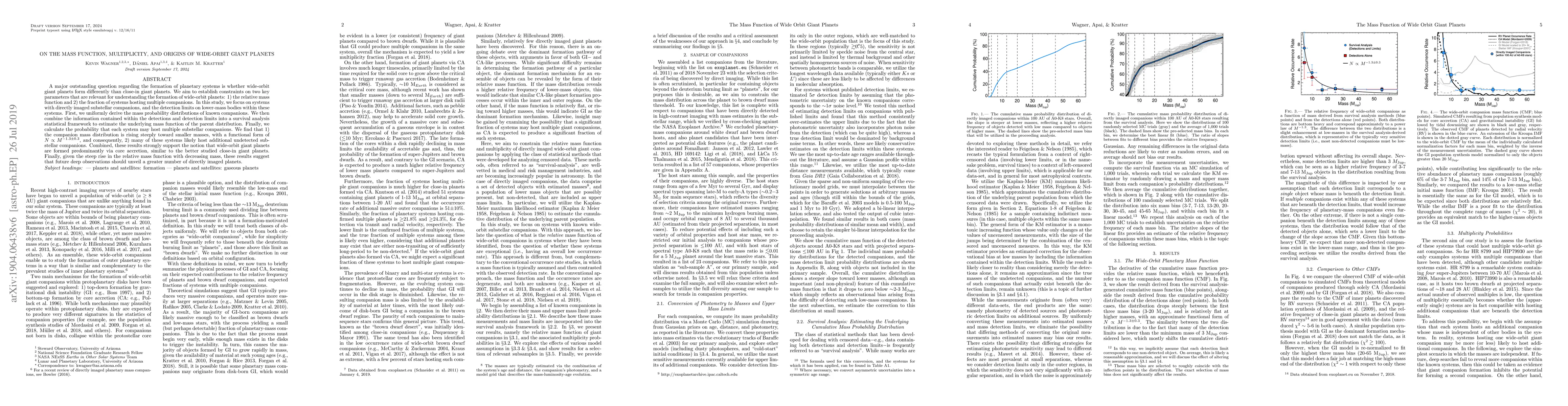 This paper investigates the mass function and multiplicity of wide-orbit giant planets, finding a steep rise in the companion mass distribution and suggesting many systems likely host additional undetected substellar companions. The results support the core accretion formation mechanism for these planets, similar to close-in giants, and predict more directly imaged planets will be discovered with future deep observations.