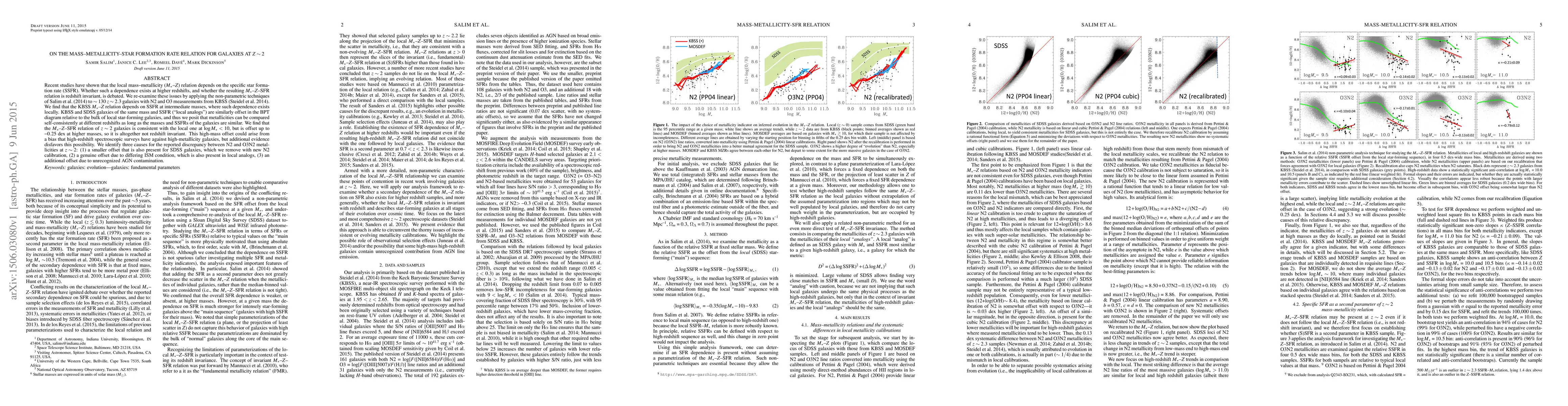 Recent studies have shown that the local mass-metallicity (M-Z) relation depends on the specific star formation rate (SSFR). Whether such a dependence exists at higher redshifts, and whether the resulting M-Z-SFR relation is redshift invariant, is debated. We re-examine these issues by applying the non-parametric techniques of Salim et al. (2014) to ~130 $z\sim2.3$ galaxies with N2 and O3 measurements from KBSS (Steidel et al. 2014). We find that the KBSS M-Z relation depends on SSFR at intermediate masses, where such dependence exists locally. KBSS and SDSS galaxies of the same mass and SSFR ("local analogs") are similarly offset in the BPT diagram relative to the bulk of local star-forming galaxies, and thus we posit that metallicities can be compared self-consistently at different redshifts as long as the masses and SSFRs of the galaxies are similar. We find that the M-Z-SFR relation of $z\sim2$ galaxies is consistent with the local one at $\log M_*<10$, but is offset up to -0.25 dex at higher masses, so it is altogether not redshift invariant. This high-mass offset could arise from a bias that high-redshift spectroscopic surveys have against high-metallicity galaxies, but additional evidence disfavors this possibility. We identify three causes for the reported discrepancy between N2 and O3N2 metallicities at $z\sim2$: (1) a smaller offset that is also present for SDSS galaxies, which we remove with new N2 calibration, (2) a genuine offset due to differing ISM condition, which is also present in local analogs, (3) an additional offset due to unrecognized AGN contamination.