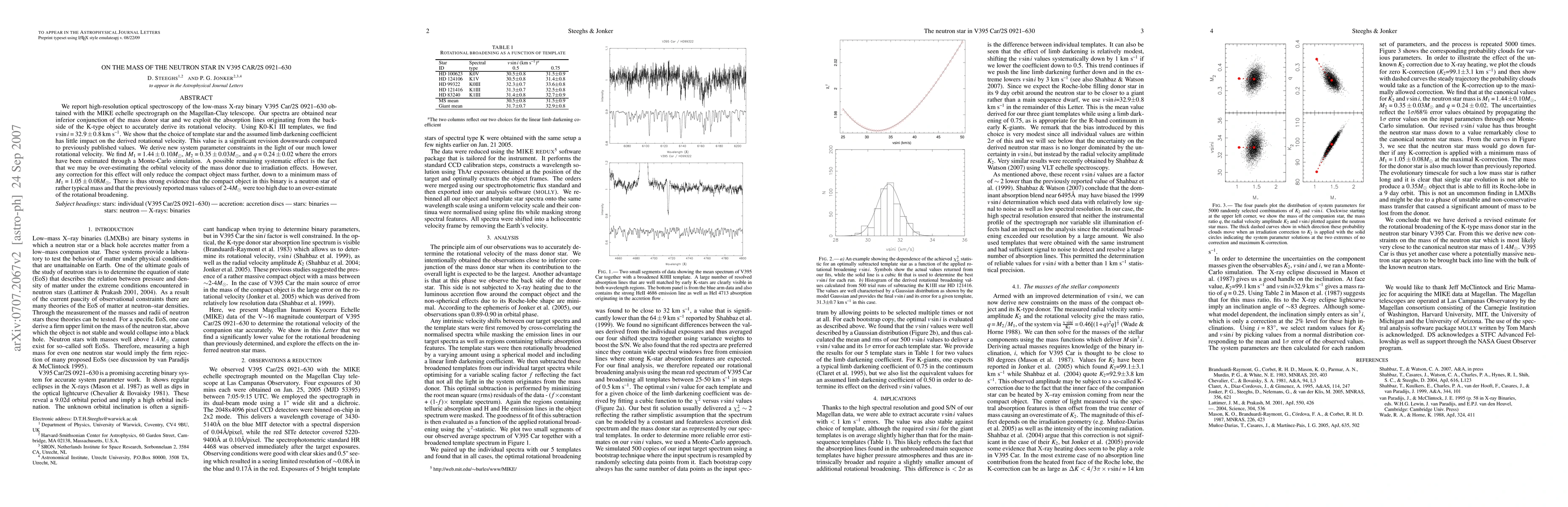 We report high-resolution optical spectroscopy of the low-mass X-ray binary V395 Car/2S 0921-630 obtained with the MIKE echelle spectrograph on the Magellan-Clay telescope. Our spectra are obtained near superior conjunction of the mass donor star and we exploit the absorption lines originating from the back-side of the K-type object to accurately derive its rotational velocity. Using K0-K1 III templates, we find vsini=32.9 +/- 0.8 km/s. We show that the choice of template star and the assumed limb darkening coefficient has little impact on the derived rotational velocity. This value is a significant revision downwards compared to previously published values. We derive new system parameter constraints in the light of our much lower rotational velocity. We find M_1=1.44 +/- 0.10 Msun, M_2=0.35 +/- 0.03 Msun, and q=0.24 +/- 0.02 where the errors have been estimated through a Monte-Carlo simulation. A possible remaining systematic effect is the fact that we may be over-estimating the orbital velocity of the mass donor due to irradiation effects. However, any correction for this effect will only reduce the compact object mass further, down to a minimum mass of M_1=1.05 +/- 0.08 Msun. There is thus strong evidence that the compact object in this binary is a neutron star of rather typical mass and that the previously reported mass values of 2-4Msun were too high due to an over-estimate of the rotational broadening.
