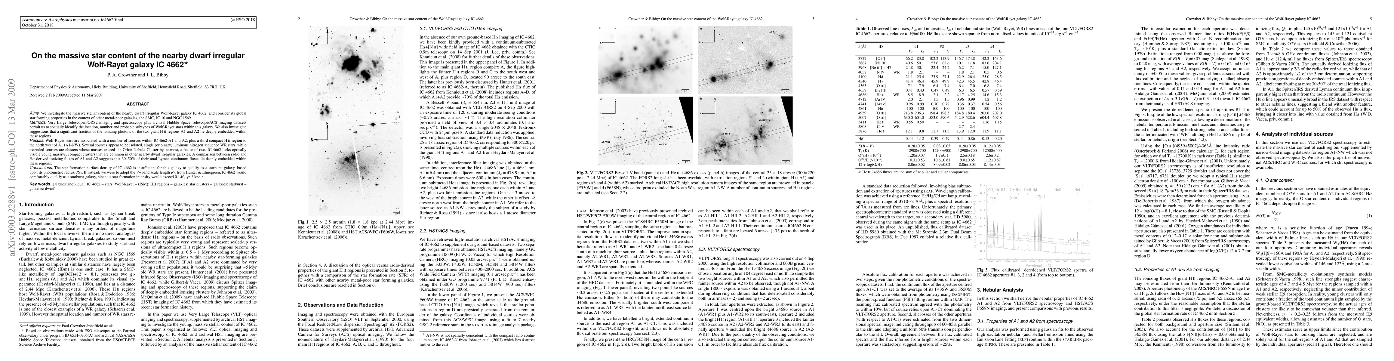 This study uses VLT and HST data to analyze the massive star population in the dwarf irregular Wolf-Rayet galaxy IC 4662, identifying Wolf-Rayet stars and suggesting that 30-50% of ionizing photons from two giant HII regions are deeply embedded. The galaxy lacks young massive clusters typical of other dwarf irregulars, and its star formation intensity does not qualify it as a starburst galaxy by conventional measures but would if a different scale length is used.