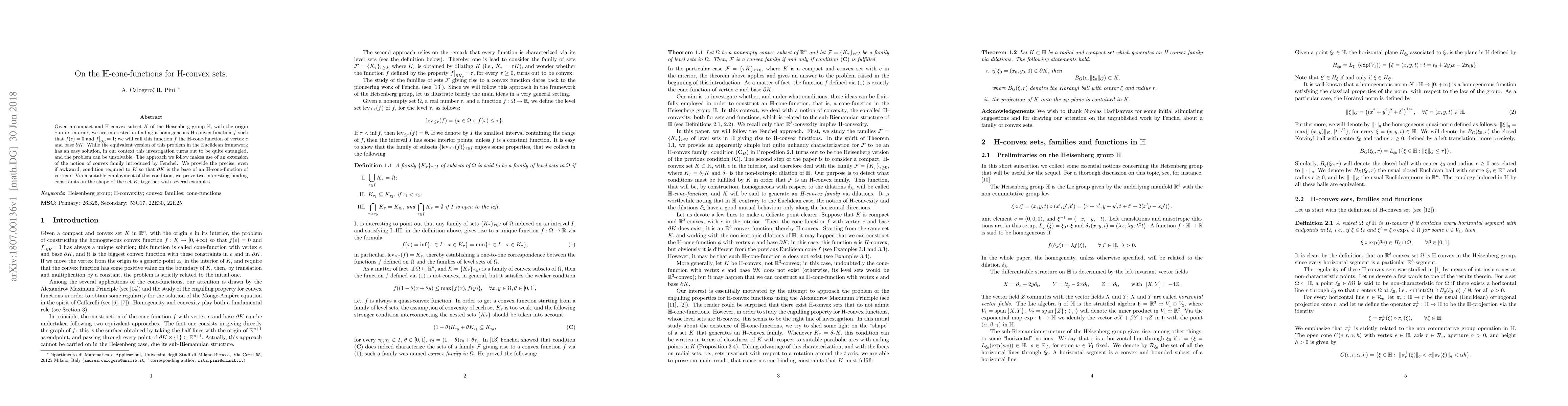Given a compact and H-convex subset $K$ of the Heisenberg group ${\mathbb H}$, with the origin $e$ in its interior, we are interested in finding a homogeneous H-convex function $f$ such that $f(e)=0$ and $f\bigl|_{\partial K}=1$; we will call this function $f$ the ${\mathbb H}$-cone-function of vertex $e$ and base $\partial K$. While the equivalent version of this problem in the Euclidean framework has an easy solution, in our context this investigation turns out to be quite entangled, and the problem can be unsolvable. The approach we follow makes use of an extension of the notion of convex family introduced by Fenchel. We provide the precise, even if awkward, condition required to $K$ so that $\partial K$ is the base of an ${\mathbb H}$-cone-function of vertex $e.$ Via a suitable employment of this condition, we prove two interesting binding constraints on the shape of the set $K,$ together with several examples.