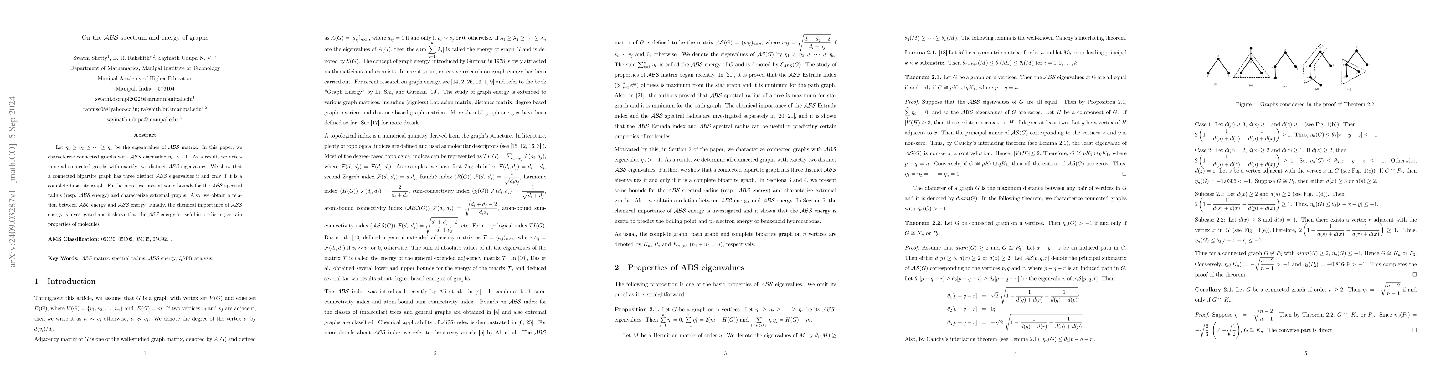 This paper characterizes connected graphs with specific properties of their $\mathcal{ABS}$ eigenvalues, determining those with exactly two distinct eigenvalues and proving that a connected bipartite graph has three distinct $\mathcal{ABS}$ eigenvalues if and only if it is a complete bipartite graph. It also explores bounds for $\mathcal{ABS}$ spectral radius and energy, and investigates the chemical significance of $\mathcal{ABS}$ energy in predicting molecular properties.