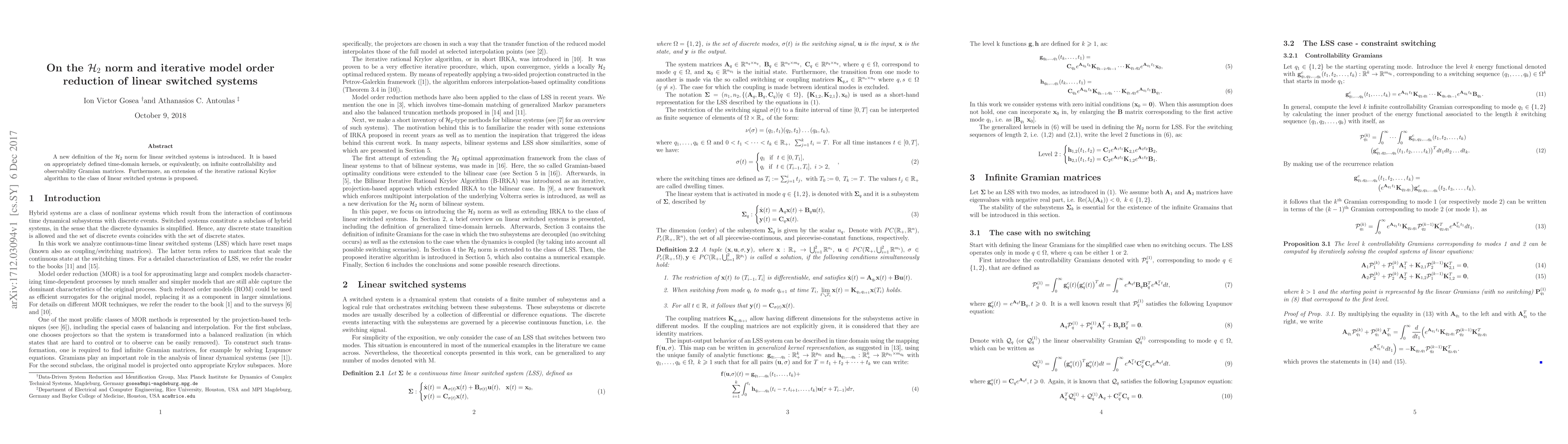 A new definition of the $ extit{H}_2$ norm for linear switched systems is introduced using time-domain kernels or Gramian matrices, enabling an extension of the iterative rational Krylov algorithm to this class of systems.