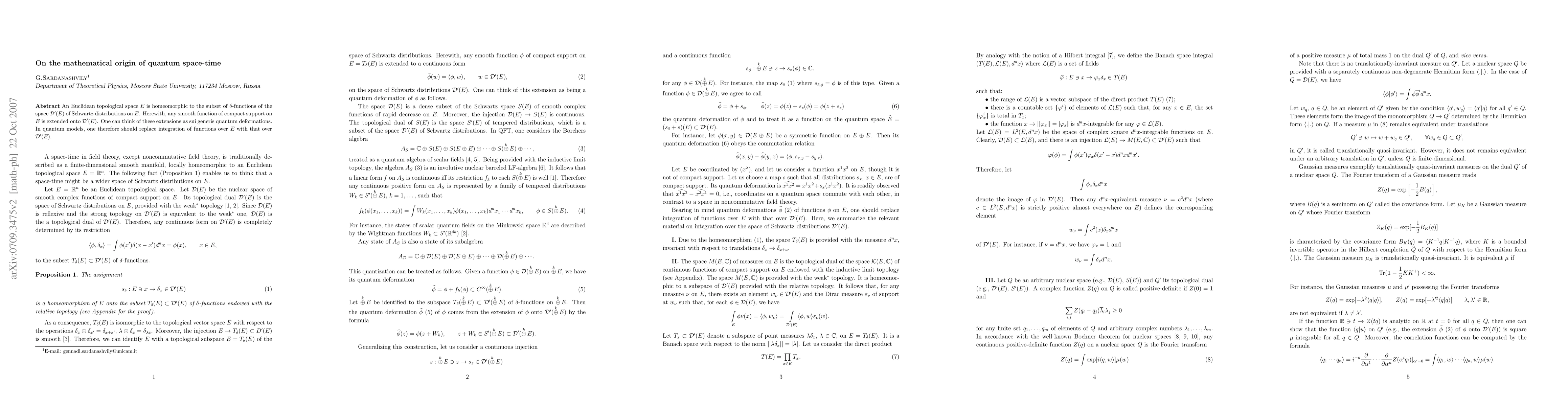 An Euclidean topological space E is homeomorphic to the subset of delta-functions of the space D'(E) of Schwartz distributions on E. Herewith, any smooth function of compact support on E is extended onto D'(E). One can think of these extensions as sue generis quantum deformations. In quantum models, one therefore should replace integration of functions over E with that over D(E).