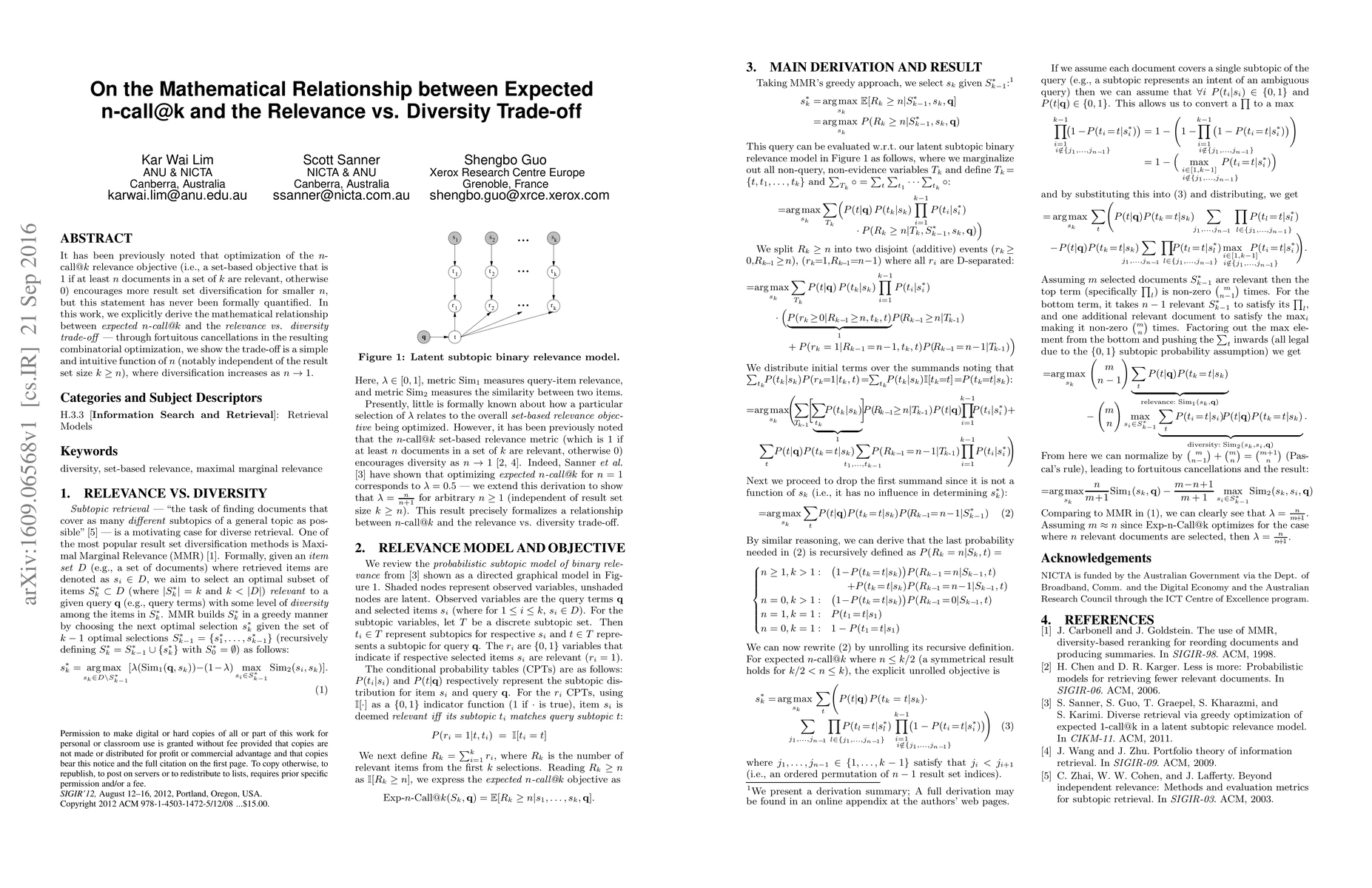 It has been previously noted that optimization of the n-call@k relevance objective (i.e., a set-based objective that is 1 if at least n documents in a set of k are relevant, otherwise 0) encourages more result set diversification for smaller n, but this statement has never been formally quantified. In this work, we explicitly derive the mathematical relationship between expected n-call@k and the relevance vs. diversity trade-off --- through fortuitous cancellations in the resulting combinatorial optimization, we show the trade-off is a simple and intuitive function of n (notably independent of the result set size k e n), where diversification increases as n approaches 1.